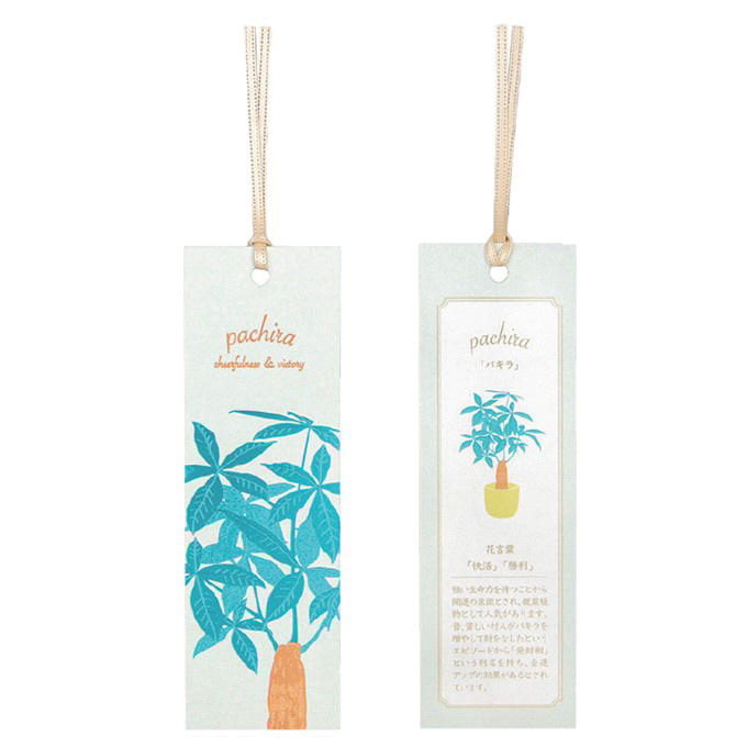 裏面には花言葉と開運豆知識を添えたデザインのしおりに仕上げました。