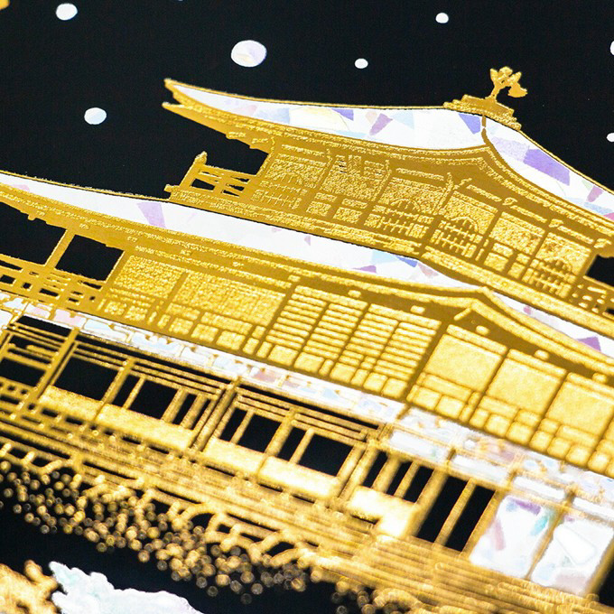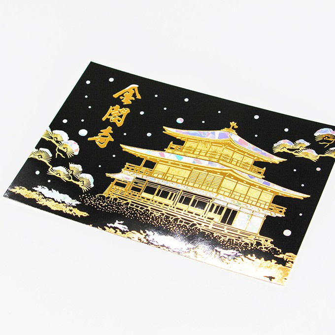 四季折々の表情を見せる金閣寺を、繊細な箔押し加工で演出したポストカードです。