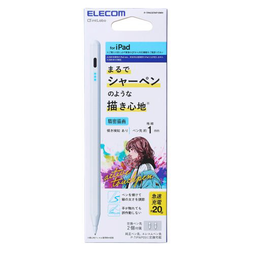 金属製のペン先でシャープペンシルのような書き心地の、iPad用アクティブタッチペンです。約1mmのペン先で細部まで書き込めて細かい作業に最適。ペンの傾き具合で線の太さを変えられる機能や、パームリジェクションにも対応しています。USB Type-C(TM) - USB Type-C(TM)ケーブルで充電ができ、4段階に光るLEDランプでバッテリーの残量が分かります。ペン先は、Apple Pencil (第1世代)、(第2世代)、(USB-C)、Apple Pencil Proやエレコム社製交換ペン先(P-TIPAP05・PWTIPAP05)と交換が可能で、お好みの書き味に合わせて替えることができます。