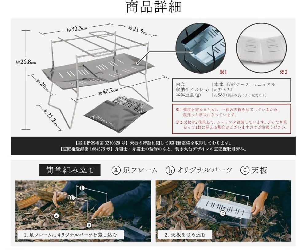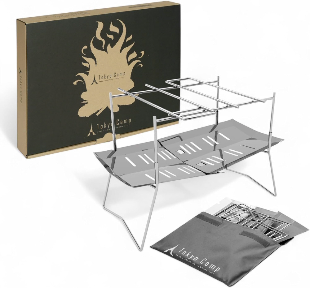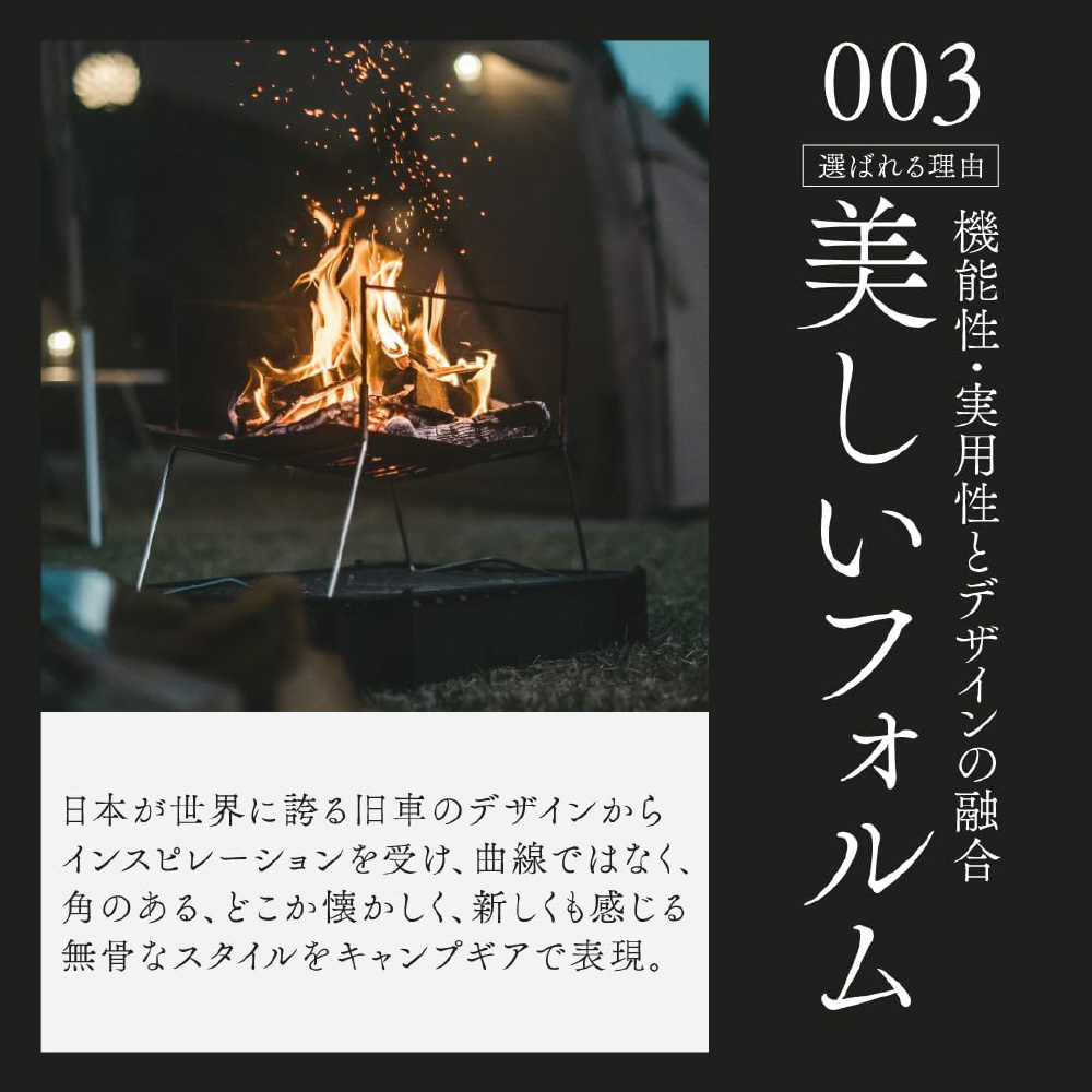 軽量かつ薄型の設計で、車載・ザックにも楽々収納可能。厚みのあるステンレス素材を採用し、繰り返しの使用や高温にも耐える「変形しにくい」焚き火台です。