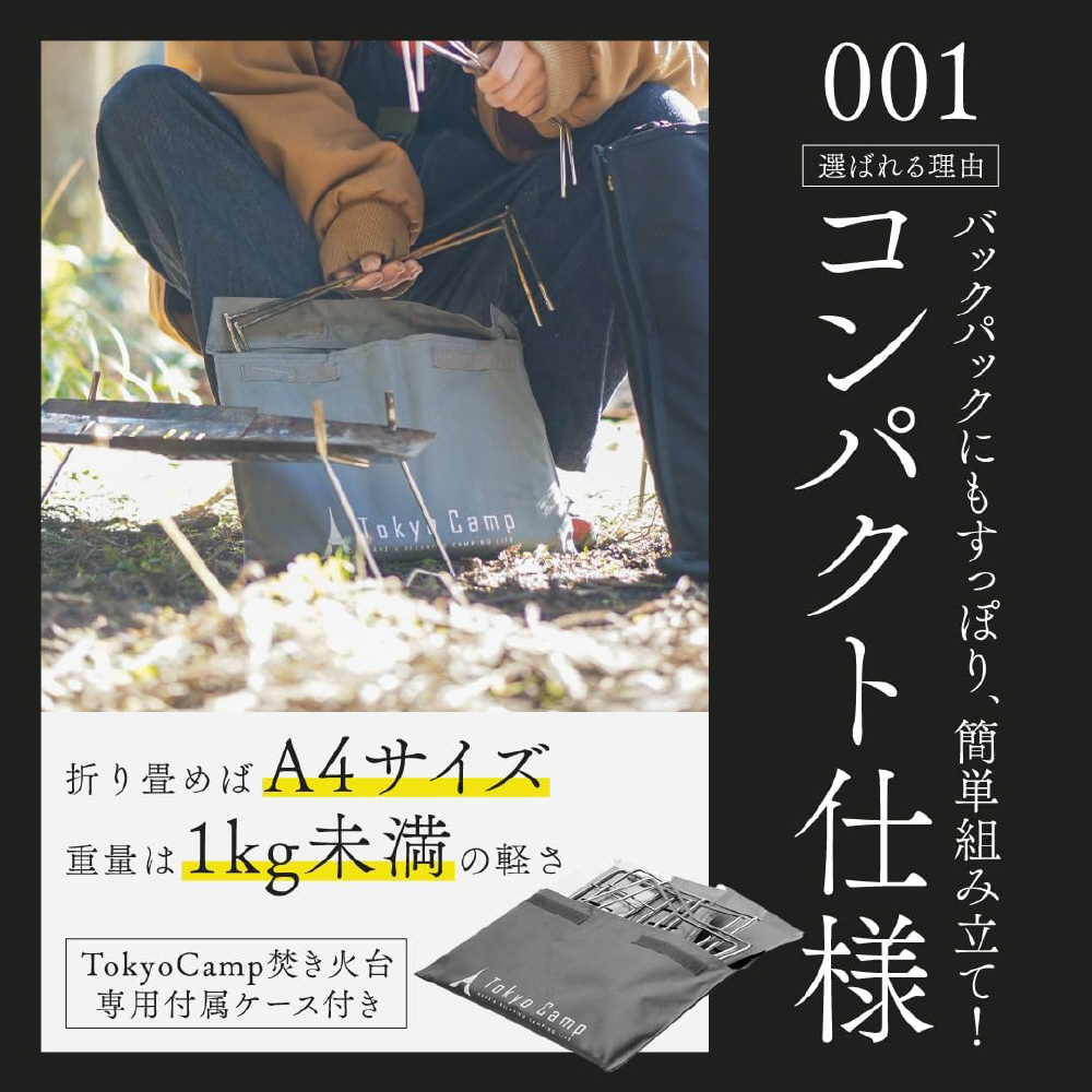 ゴトク、グリルプレート、ダッチオーブン、スキレットなど各種調理器具に対応。煮る・焼く・炊くなどの焚き火料理が可能。焚き火の時間を「調理の時間」へと昇華させるギアです。