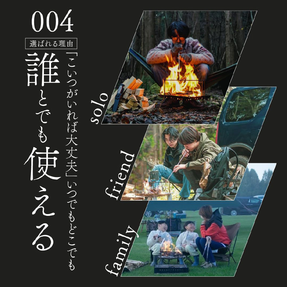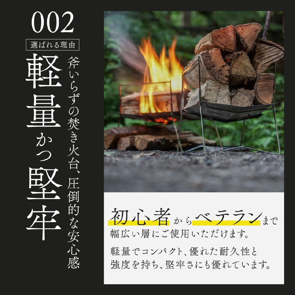 開放的な構造で通気性が高く、燃焼効率を最大化。湿った薪や太い薪でもしっかり燃え、煙がこもりにくい設計。脚部の安定性も高く、地面が多少不安定でもしっかり設置できます。