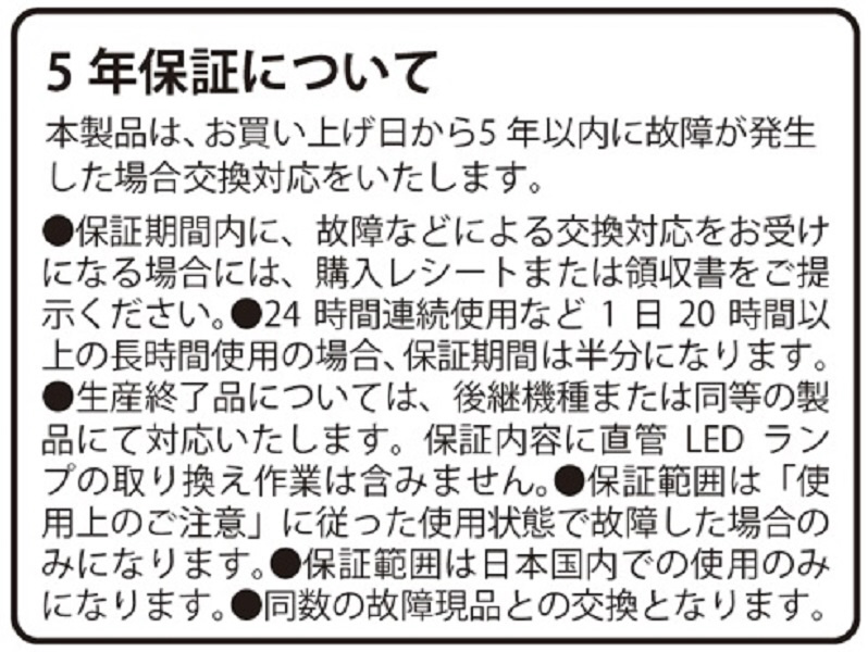 LED直管 普及価格帯で初めての5年保証で安心してお使いいただけます。