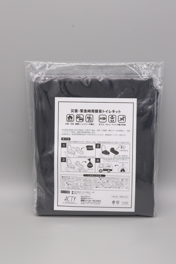 簡易トイレ×1個 抗菌性凝固剤 排便袋×10個 ソフトパックティッシュ×1個 目隠しアルミシート×1個