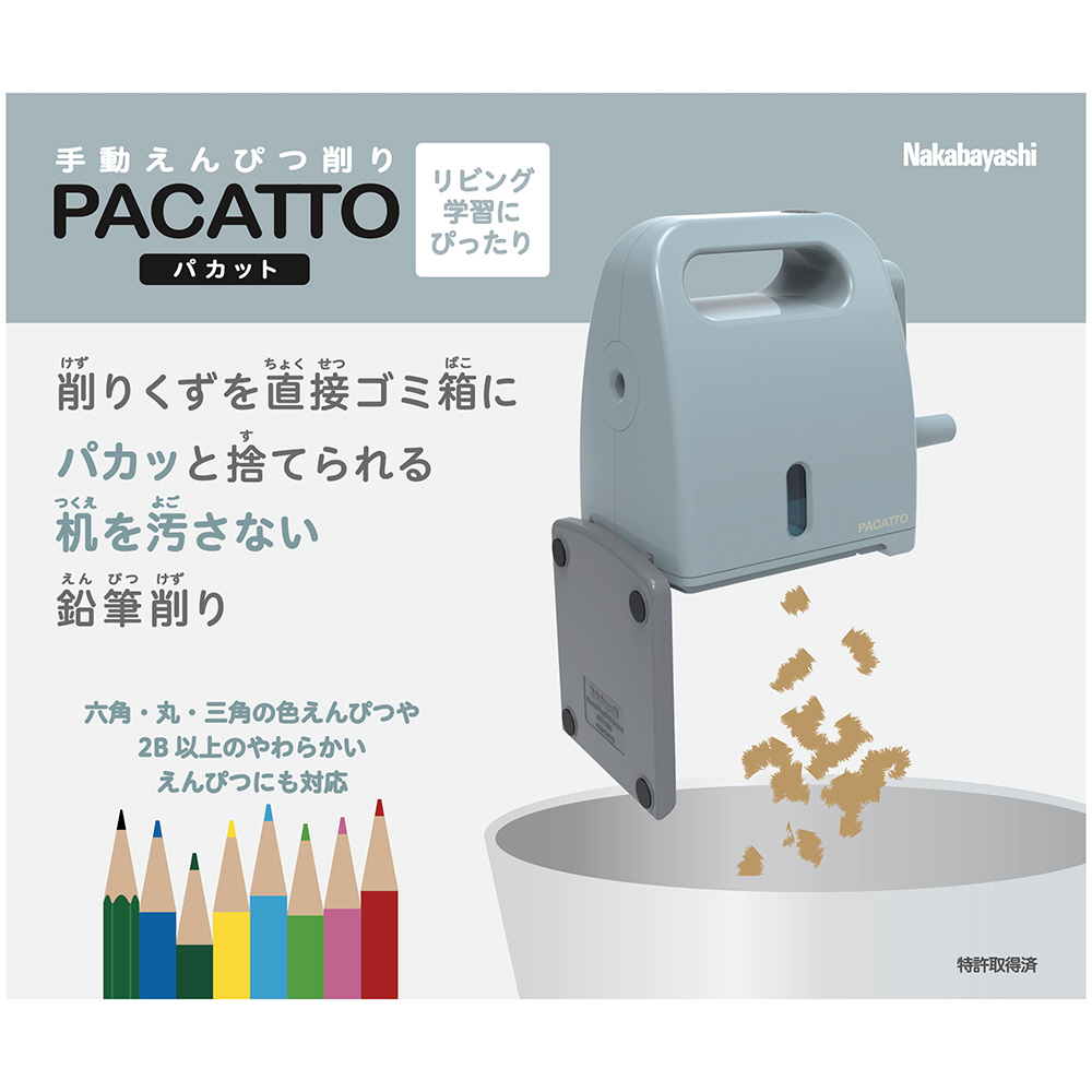 手動鉛筆削りPACATTOは、削りくずを直接ゴミ箱に“パカッ”と捨てられる、机を汚さない鉛筆削りです。切削可能鉛筆外径6.5〜8mmまでの木質鉛筆が削れます。六角形、丸、三角形の鉛筆対応。最短切削可能長41mm。
