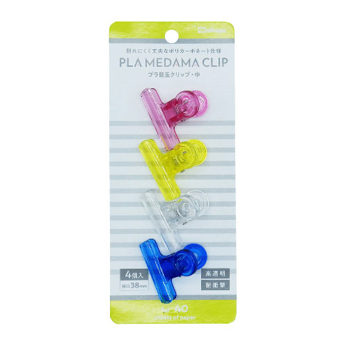 ●寸法:挟口38mm●材質:ポリカーボネート,スチール●包装:フックの出来る再生PET樹脂スライドパック●入数:4個●色:クリアカラーの赤・青・黄・透明