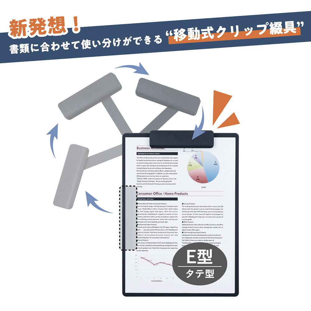 タテヨコ兼用クリップボード「シフテ」は、移動式のクリップがついたタテヨコ兼用のクリップボードです。書類に合わせてタテ型とヨコ型を使い分けることができます。開け閉めがしやすいワイドクリップカバー付きの綴具を採用しました。2.8mmの極厚ボードで、立ったままでの筆記でもたわみにくく、しっかりと書き込めます。コピー用紙を最大30枚はさむことができます。