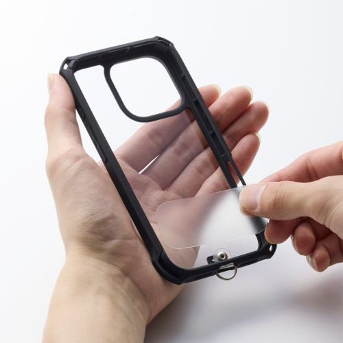 ケースにストラップホールがなくても、付属のストラップホールシートをスマートフォンとケースの間に挟むだけで使用できます。