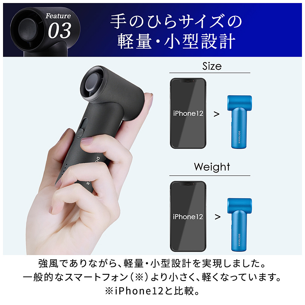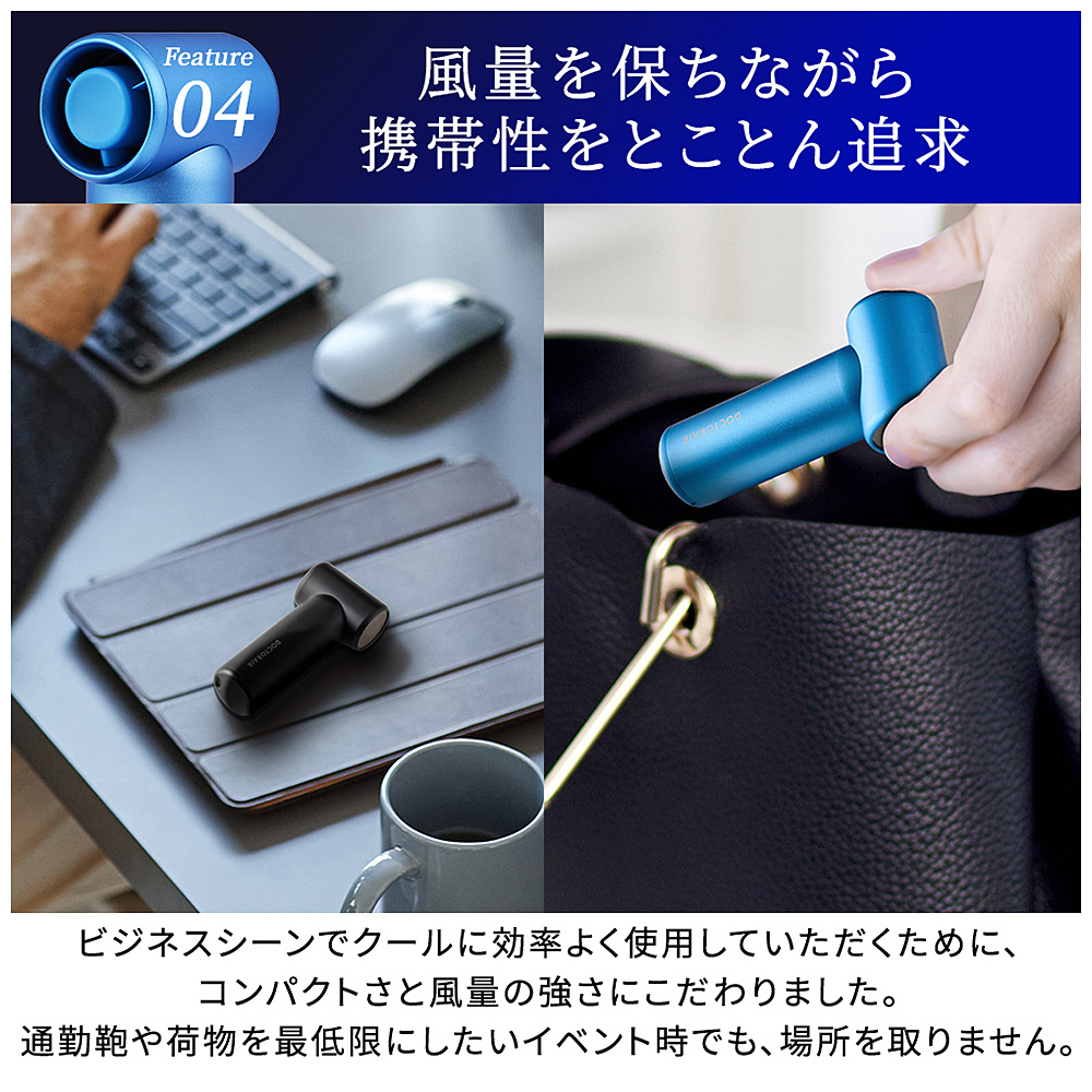 サッと取り出してクールに効率よく使用していただくために、コンパクトさと風量の強さにこだわりました。