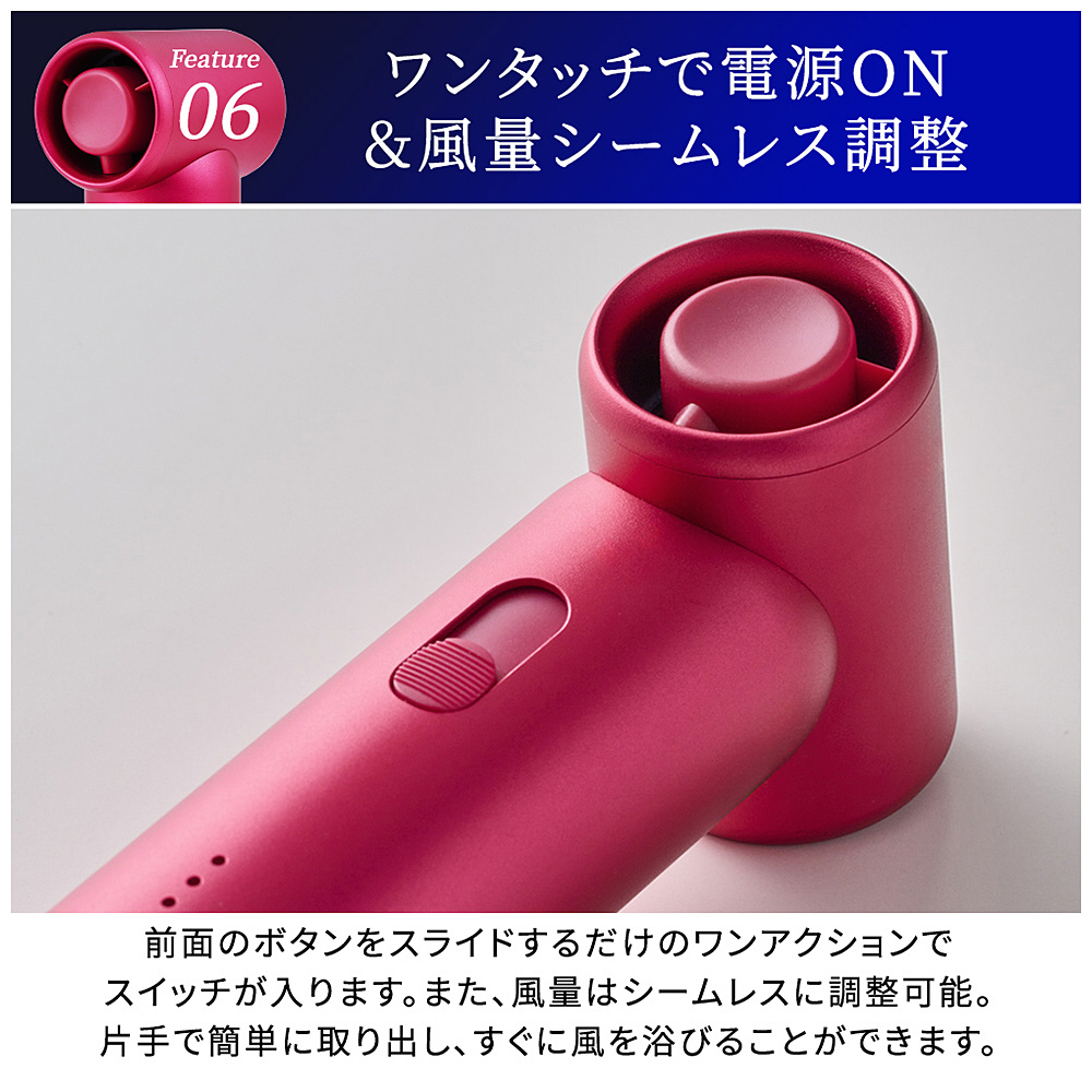 本体を身体から離して使用しても十分に届く(最大6.8m/s)の風量。顔に近づけすぎたり、くるくる動かしながら使用する必要がありません。