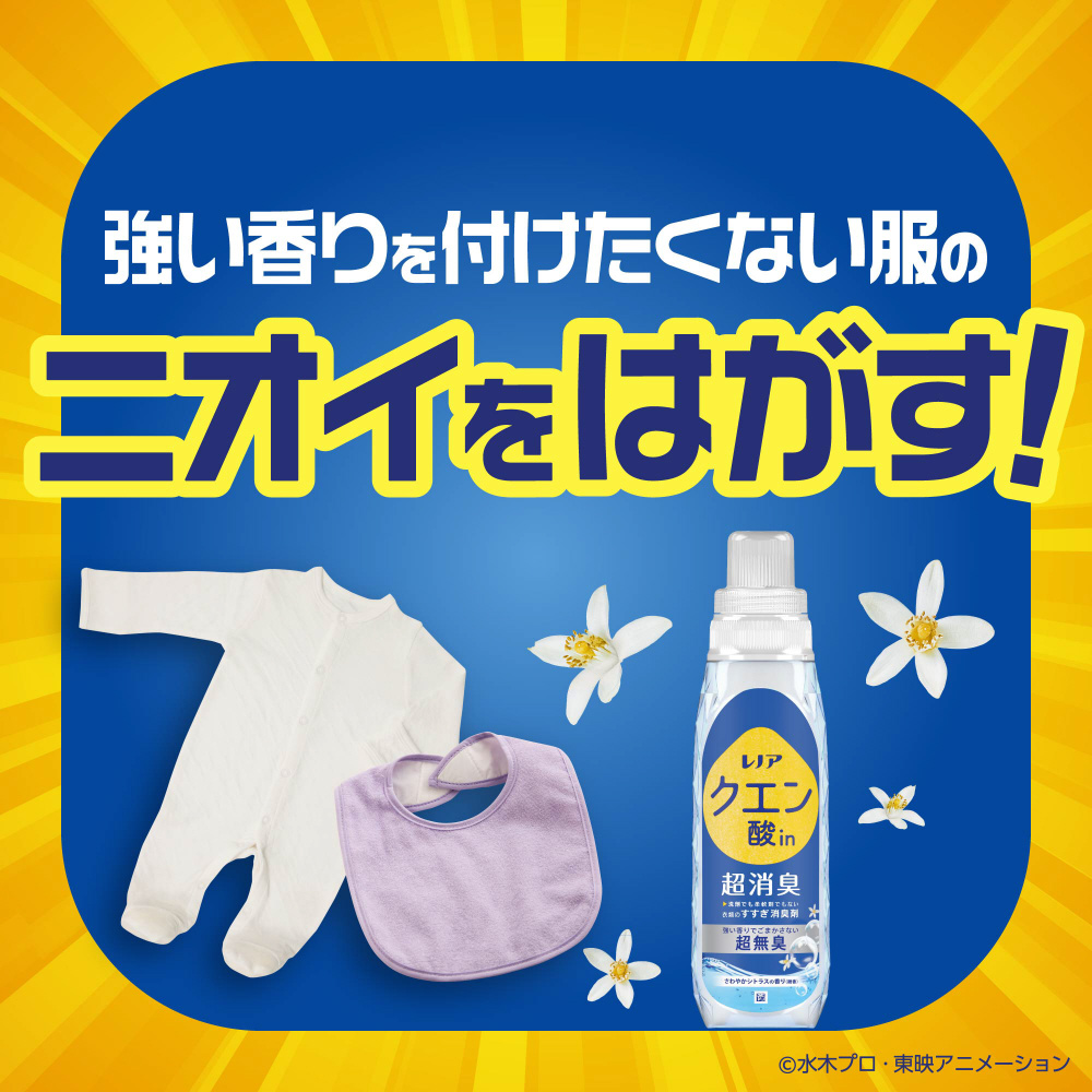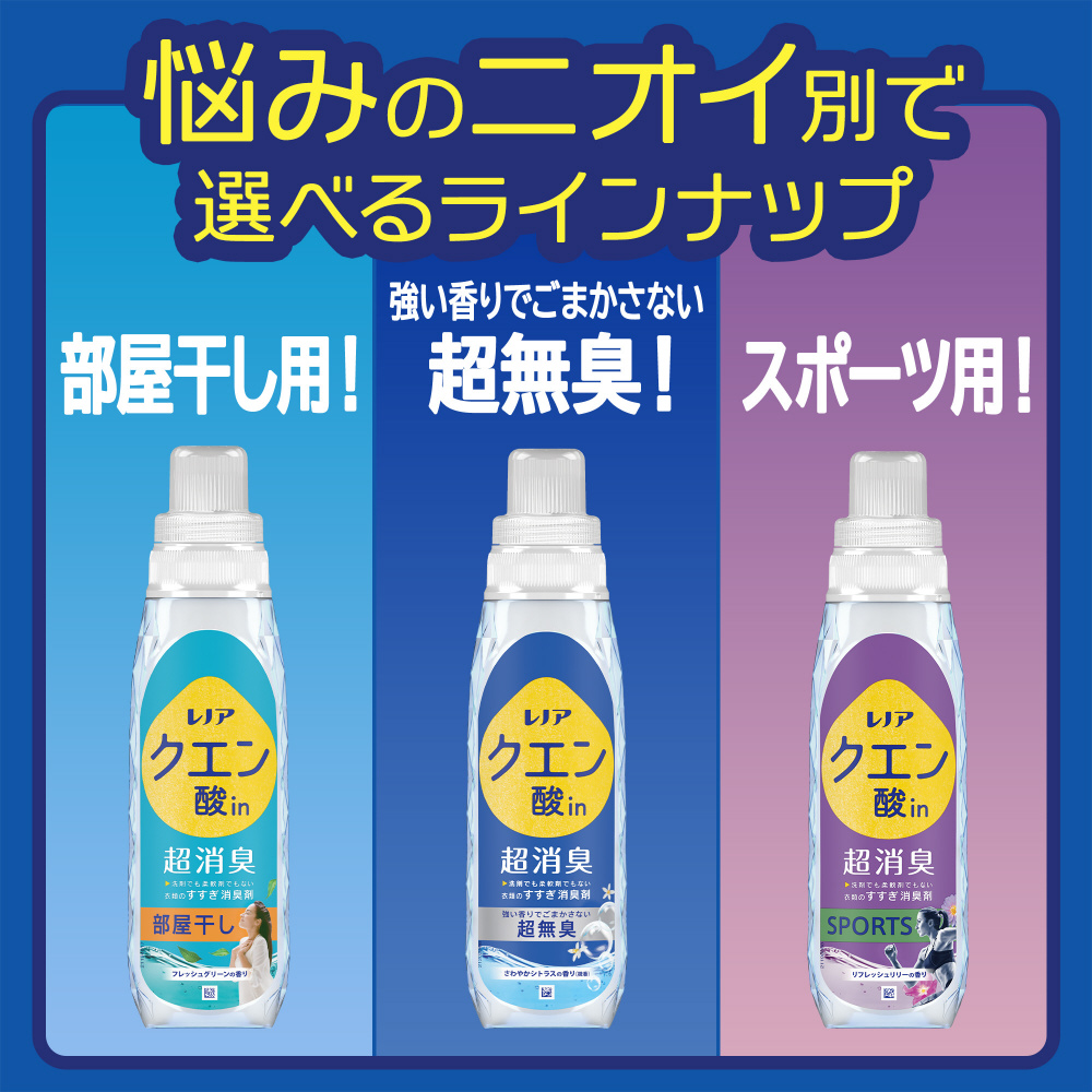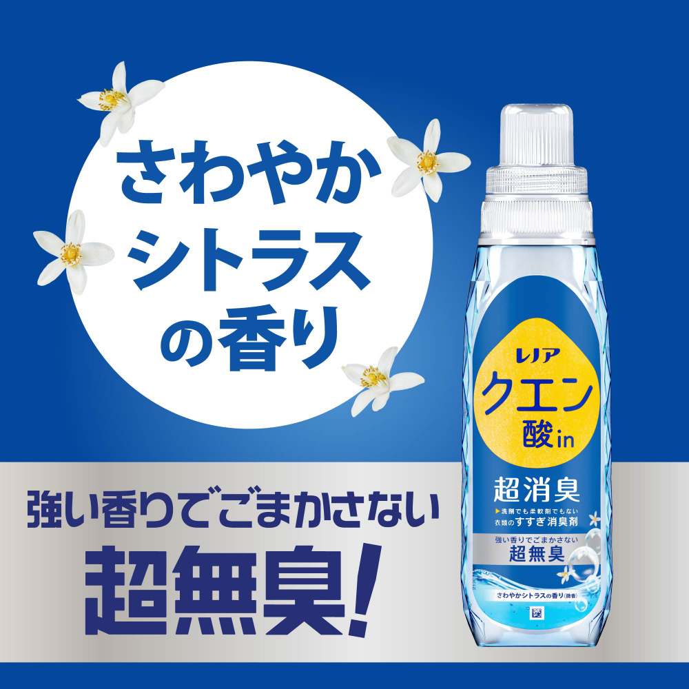 強い香りでごまかさない消臭力柔軟剤を使ったタオルの吸水力UP!*2肌にやさしい漂白剤なしでも一発消臭*3自然由来クエン酸配合すすぎ一回でもOKさわやかシトラスの香り(微香)