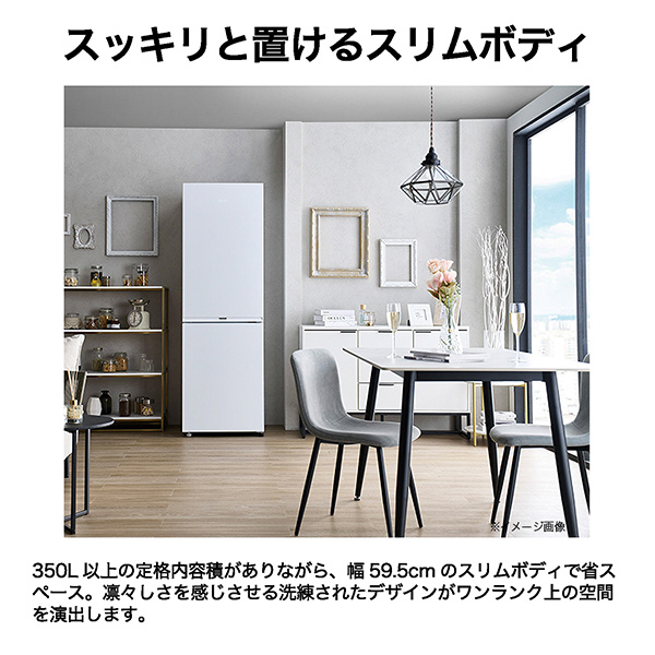 350L以上の定格内容積がありながら、幅59.5cmのスリムボディで省スペース。