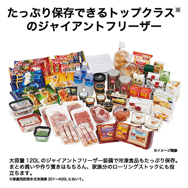大容量120Lのジャイアントフリーザー装備で冷凍食品もたっぷり保存。