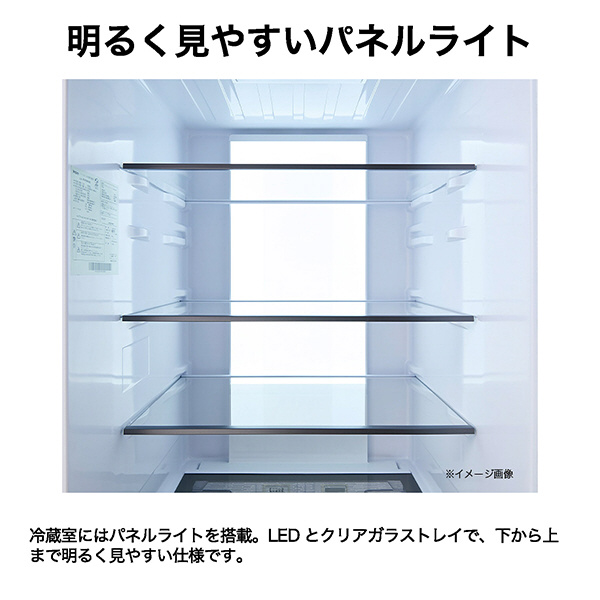 冷蔵室にはパネルライトを搭載。LEDとクリアガラストレイで、下から上まで明るく見やすい仕様です。