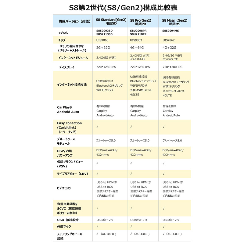 S8のデュアルBluetooth機能により、電話とBTデバイスとの同時接続が容易になります。BT2はインターネットアクセス用の電話またはエンジンコードスキャニング用のOBD2デバイスに接続します。BT1はBluetoothハンズフリー&A2DPオーディオとして機能し、音声アシスタント(Siri、Googleアシスタント)の起動やプライバシーのための画面のロック/ロック解除が可能です。電話リンクは有線/無線のAndroid AutoとCarPlayをサポートしています。S8とともに、シームレスな接続と機能の向上をお楽しみください。