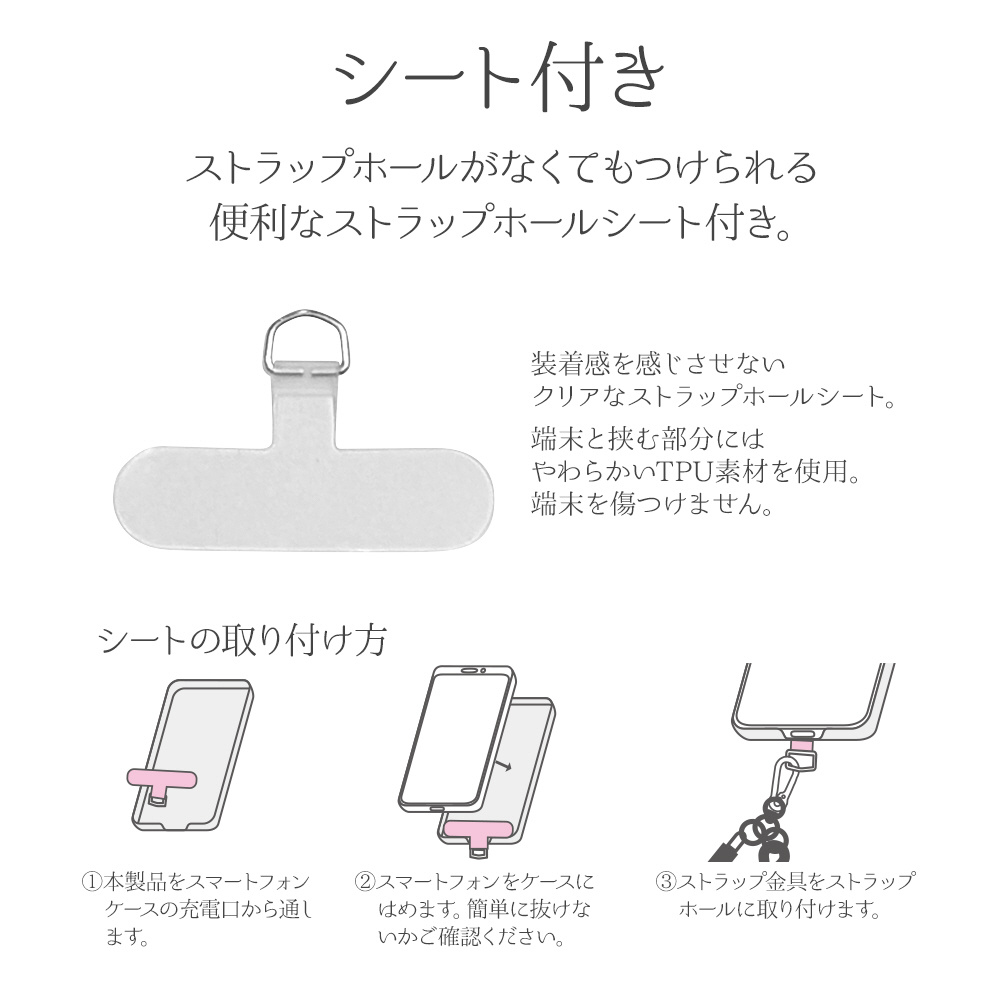 ストラップホールシートはストラップホールがないスマートフォンにも簡単にストラップを取り付けられます。