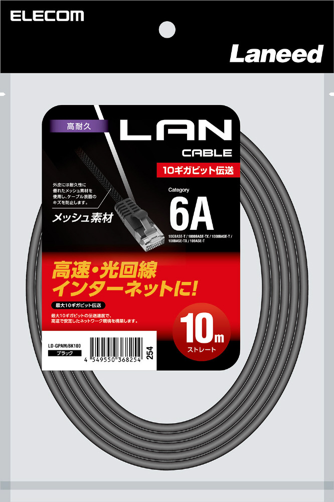 LD-GPAM/BK100 LANケーブル 高耐久 ブラック [10m /カテゴリー6A /メッシュ]
