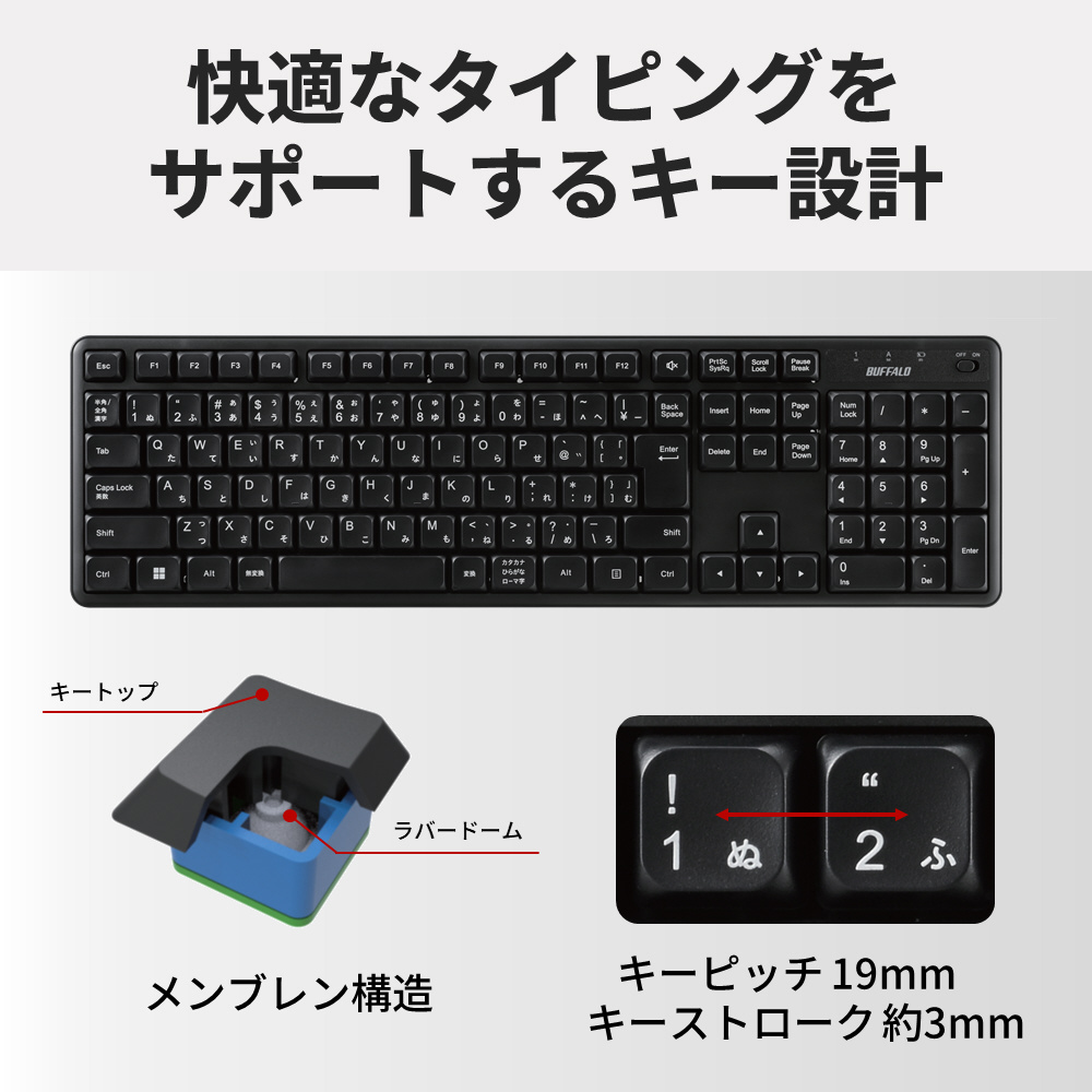 ※防音室で50cm離れた位置でのキー入力時の音量が、公益社団法人 全国家庭電気製品公正取引協会で定められた静音と定義される一般的な騒音レベル 35db未満を満たすことを確認(2024年10月、BUFFALO社調べ BUFFALO社テスト値につき保証値ではありません)
