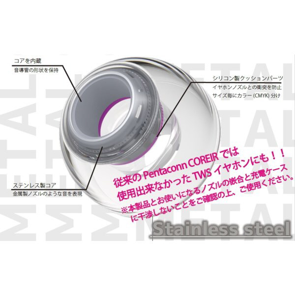 金属コアには、色付きのシリコン製クッションパーツを配置。これにより、イヤホン側のノズルと直接衝突するのを防ぎます。 また、クッションパーツはCMYKの4色展開とし、サイズ判別をしやすくしました。