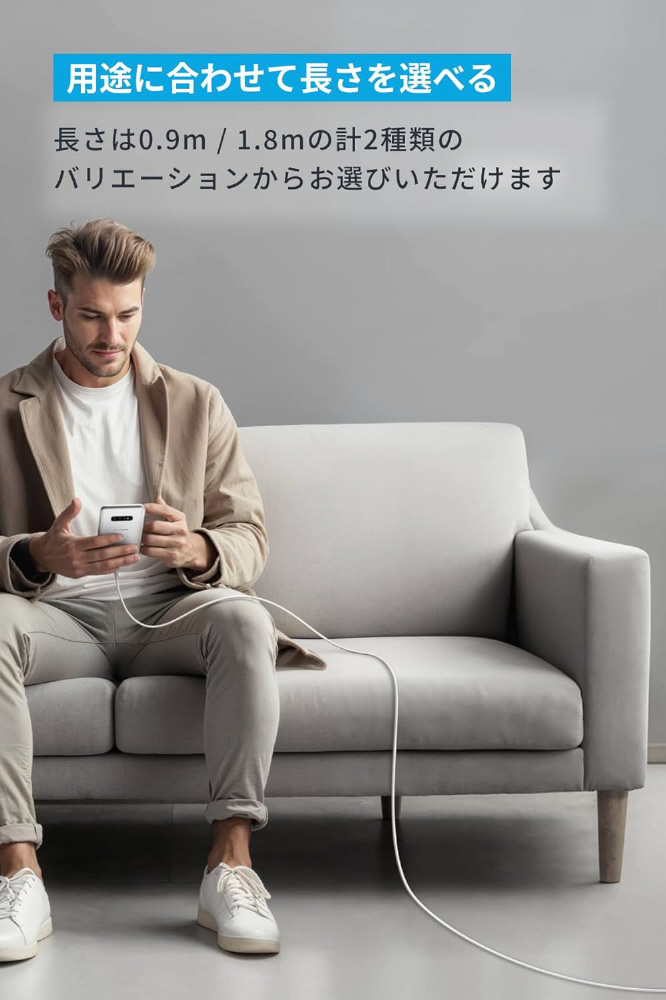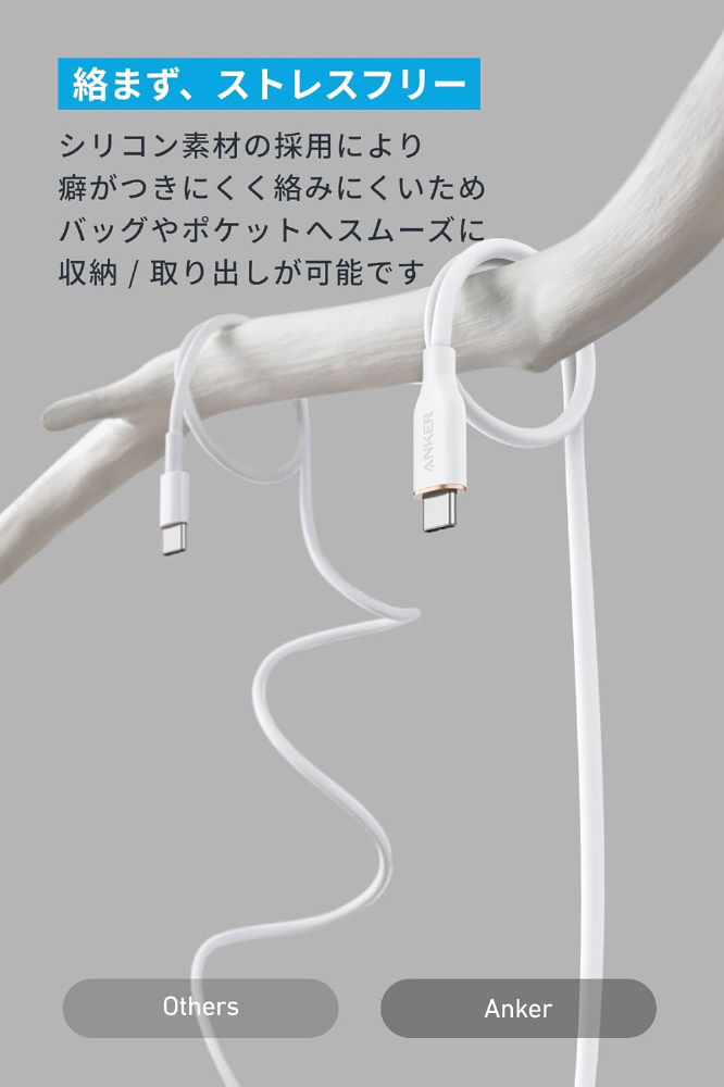 外装にシリコン素材を採用し、従来のケーブルにはない柔らかさを実現しました。