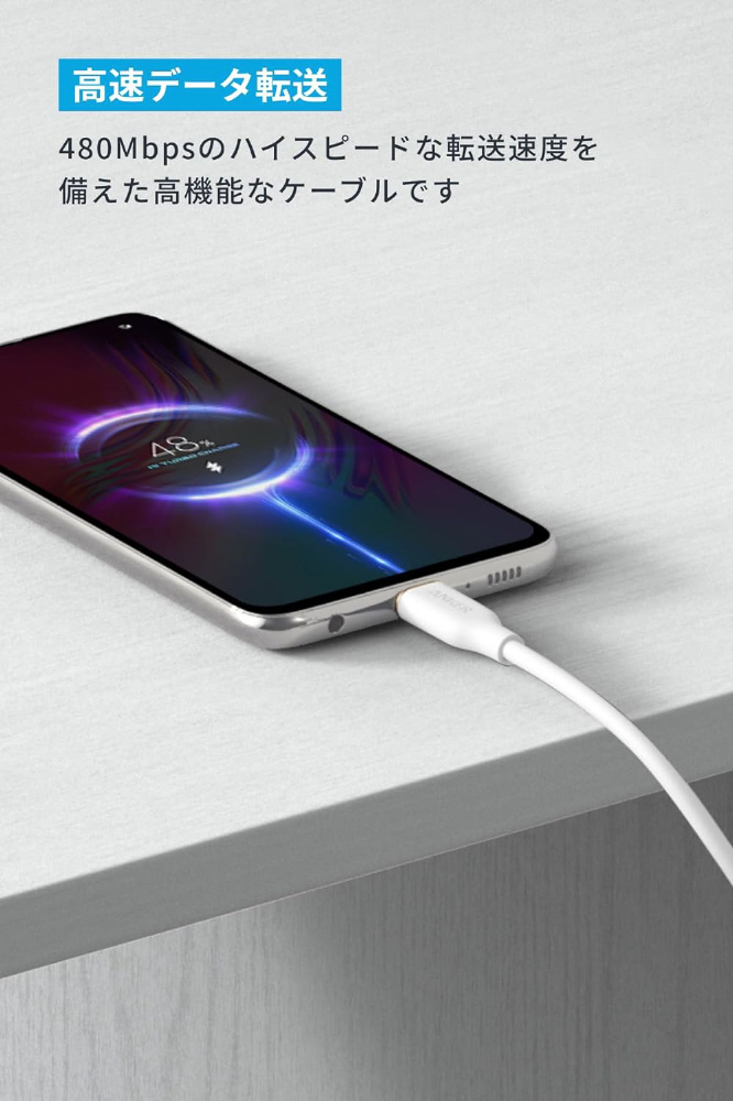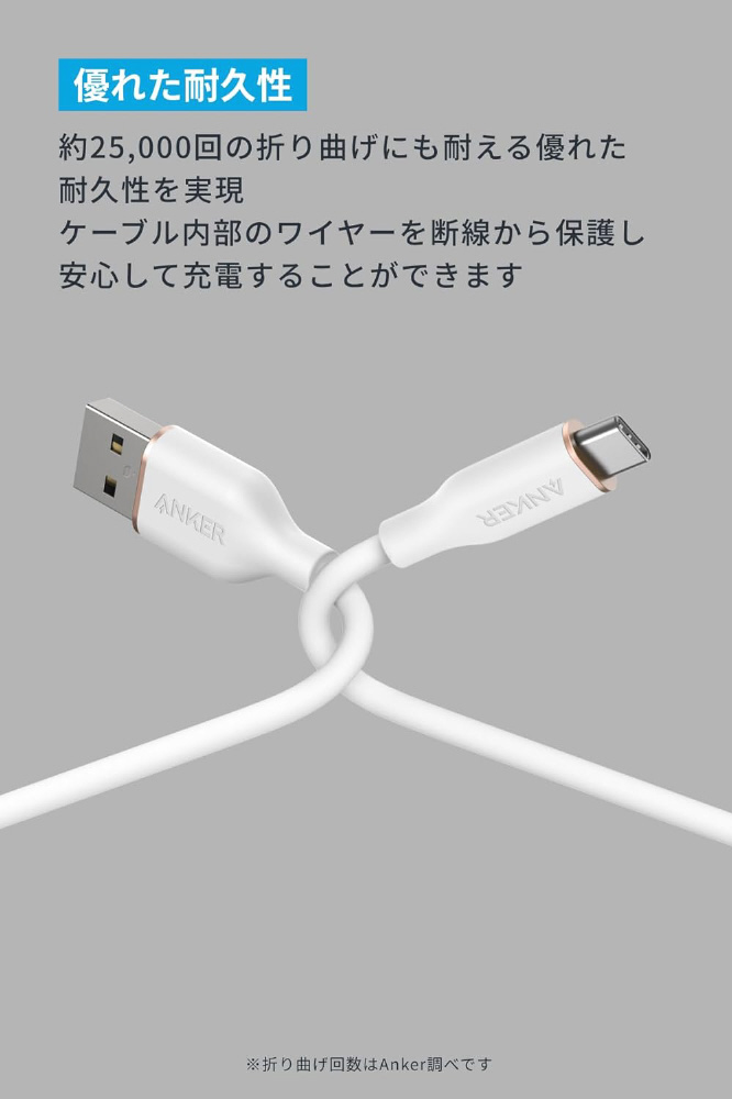 約25,000回の折り曲げにも耐える優れた耐久性を実現しているため、ケーブル内部のワイヤーを断線から保護し、安心して充電することができます。