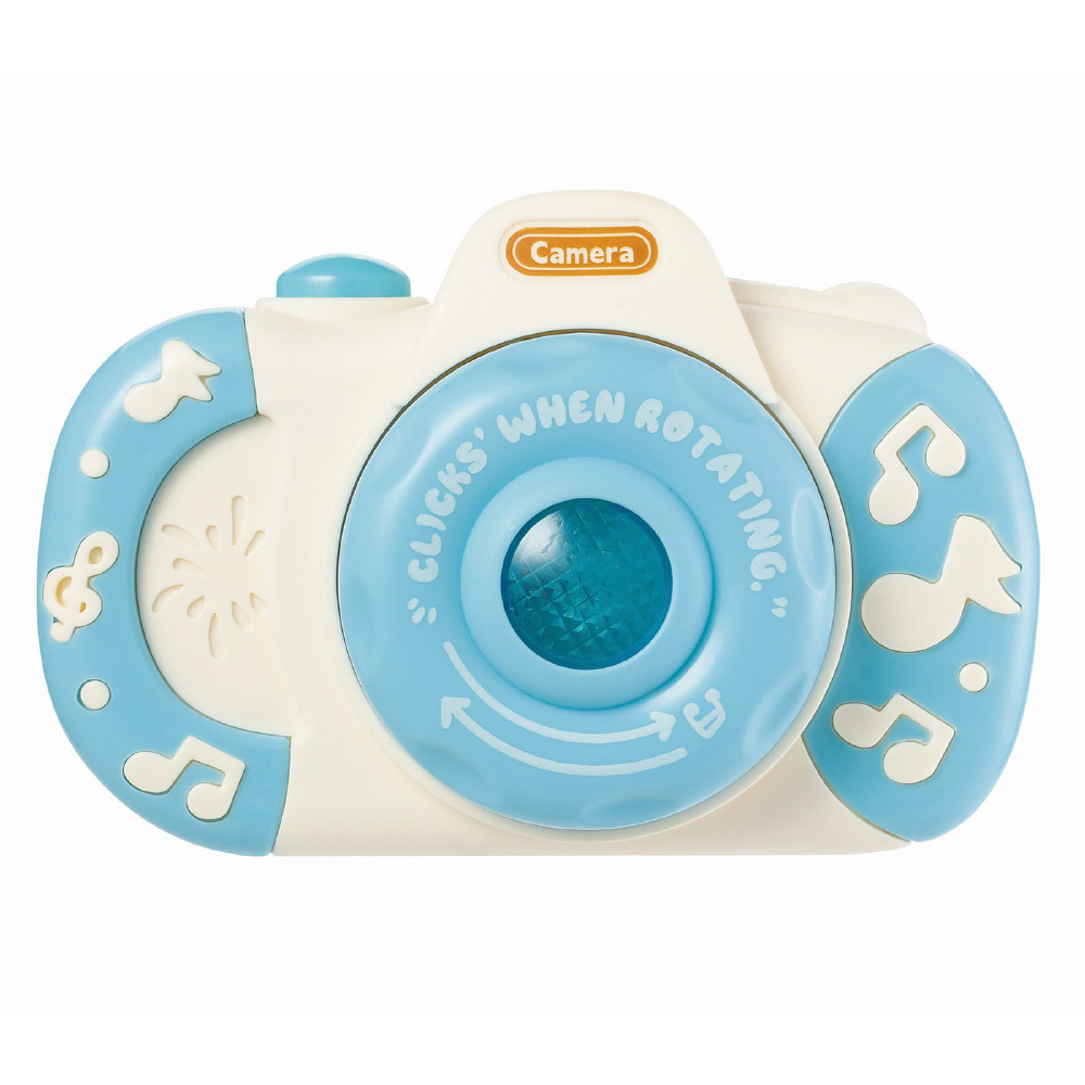 シャッターボタンを押すと音楽が複数鳴って、光るカメラ型のおもちゃです。シャッターボタンを押すとレンズ部分がフラッシュしながらメロディが流れます。さらにシャッターボタンを押すと、メロディが切り替わります。レンズ部分は、回すとカチカチ音が鳴ります。全12曲。マンガン単3電池2本使用。電池交換可能。