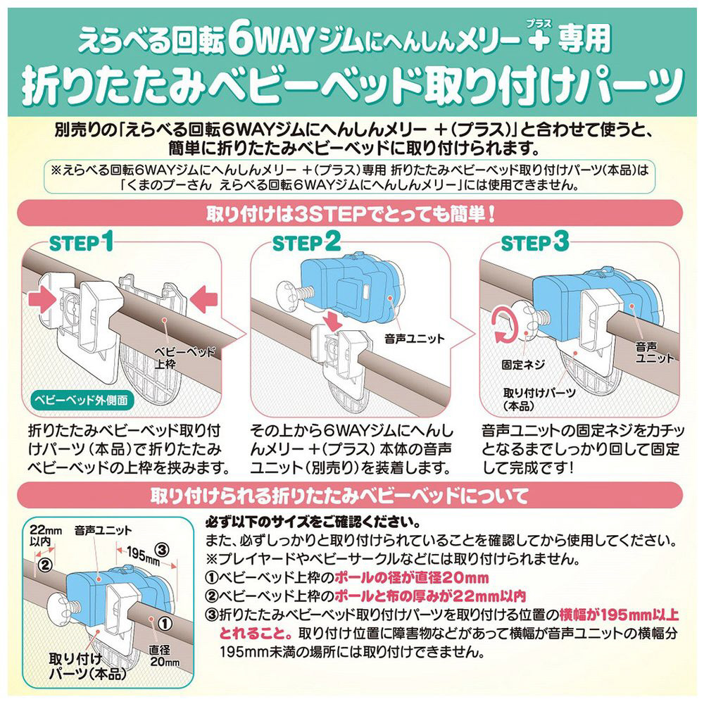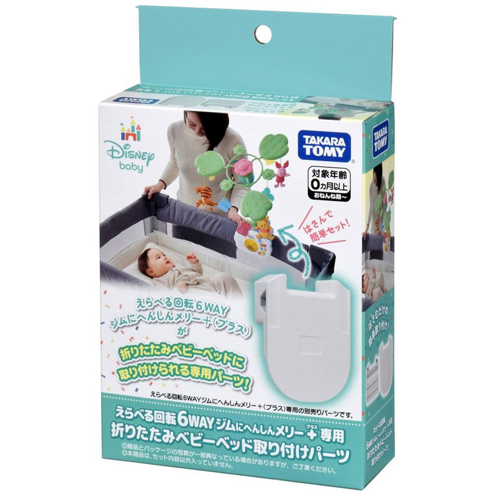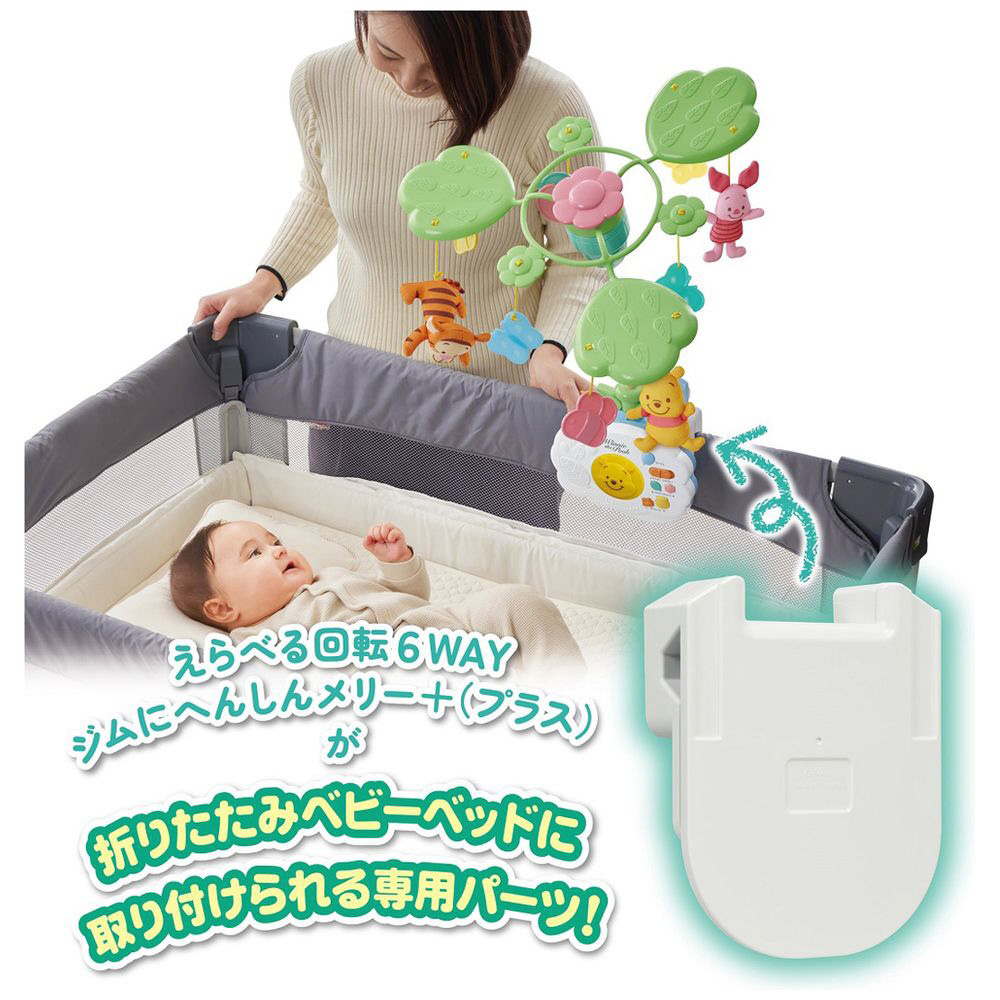 「えらべる回転 6WAYジムにへんしんメリー プラス くまのプーさん」専用の、折りたたみベビーベッドへ取り付けるための別売パーツです。