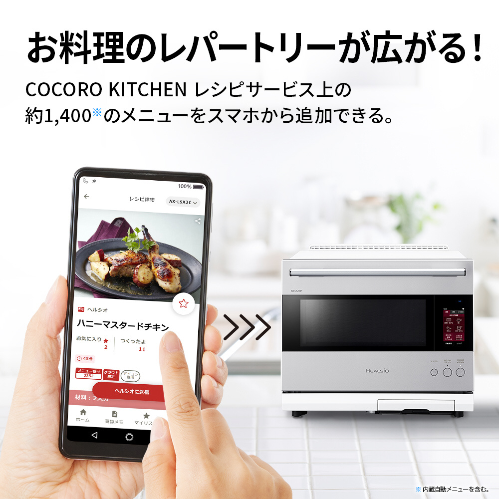 「COCORO KITCHEN レシピサービス」には約1400のメニューを掲載。外出先でもスマートフォンから新しいメニューをヘルシオに追加できます。調理時はそのメニューを呼びだしてスタートキーを押すだけなので、操作もカンタンです。またAIが調理履歴を学習し、朝・昼・夜の時間帯に応じたよく使うメニューを表示する「いつもの」画面がご家庭に合わせて進化します。