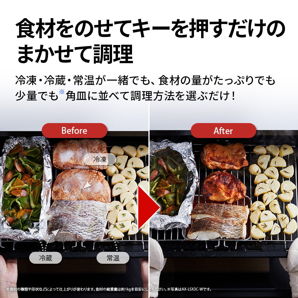 冷凍・冷蔵・常温が一緒でも、好みの種類・分量の食材を角皿において、「網焼き・揚げる」「焼く」「炒める」「蒸す・ゆでる」の4つから調理方法を選ぶだけでおいしく仕上がる「まかせて調理」。一度に複数のメニューが自動で完成するので忙しい毎日に役立ちます。