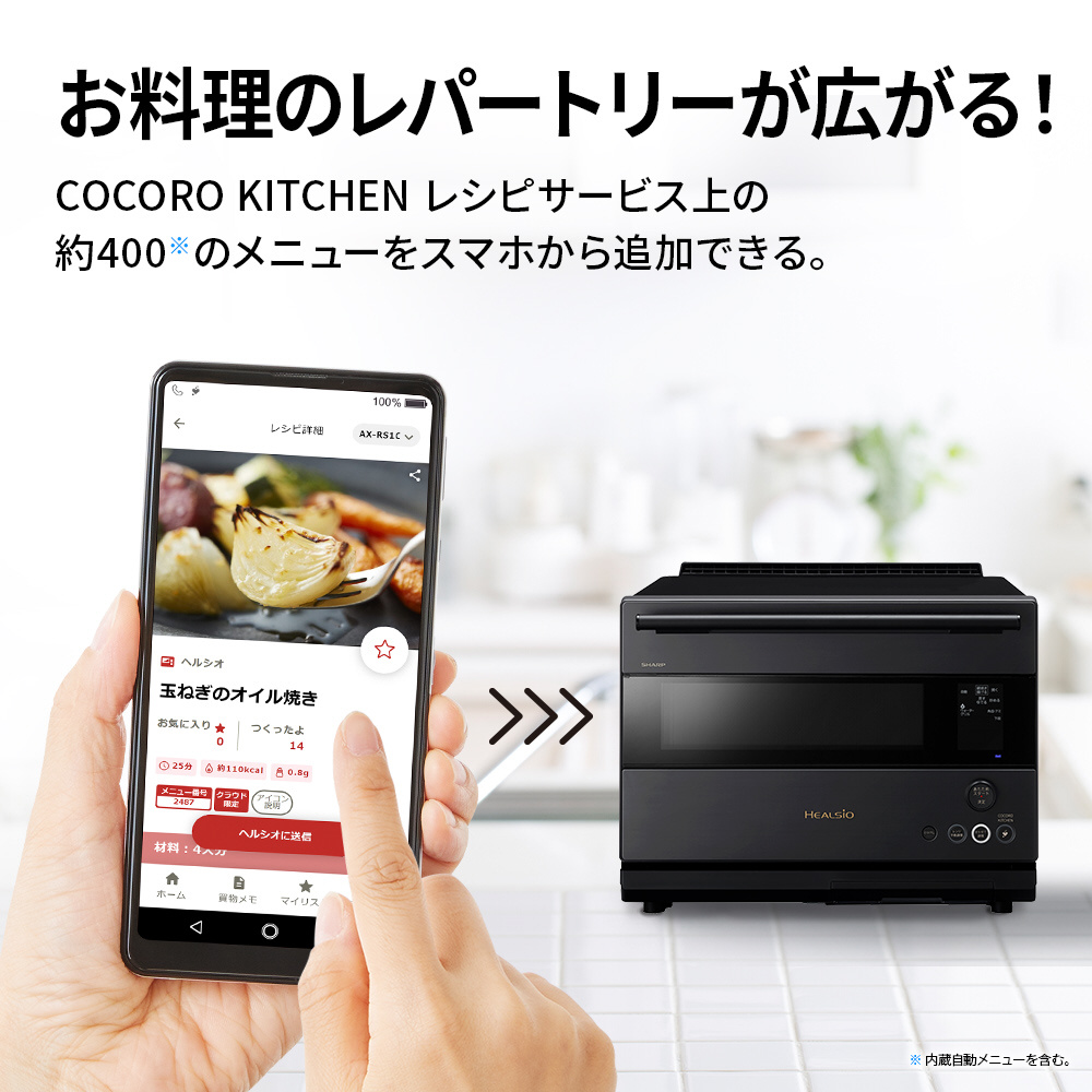 「COCORO KITCHEN レシピサービス」には約400のメニューを掲載。外出先でもスマートフォンから新しいメニューをヘルシオに追加できます。調理時はそのメニューを呼びだしてスタートキーを押すだけなので、操作もカンタンです。