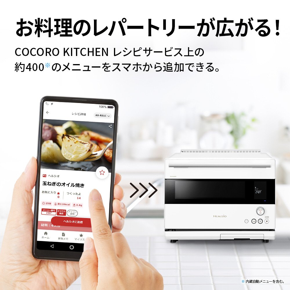 「COCORO KITCHEN レシピサービス」には約400のメニューを掲載。外出先でもスマートフォンから新しいメニューをヘルシオに追加できます。調理時はそのメニューを呼びだしてスタートキーを押すだけなので、操作もカンタンです。