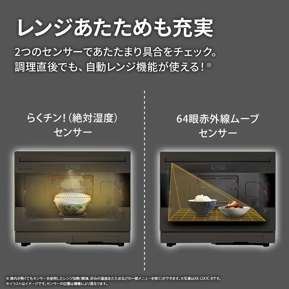 あたためられた食品から発生する蒸気で仕上がりを検知する「らくチン!(絶対湿度)センサー」と食品の温度を検知する「64眼赤外線センサー」の2つで仕上がりをチェックする自動あたためで、日常使いも便利!「らくチン!(絶対湿度)センサー」があるから、オーブン調理後で庫内が熱くても続けて、センサーを使用した自動レンジ加熱(解凍、好みの温度あたためなどの一部メニューを除く)ができます。