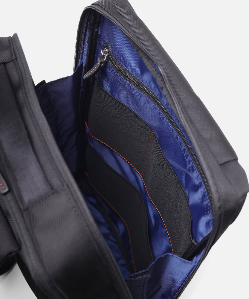 本体構造は2ルーム+前ポケット仕様で、背面ルームはクッション材入りのPC対応です。13〜14インチのパソコンが収納できます。メインルームには、ガジェット付属品などの小物も収納しやすいゴムポケットを装備。ペットボトルや小物が収納できる前ファスナーポケットなど、分類収納にも優れています。