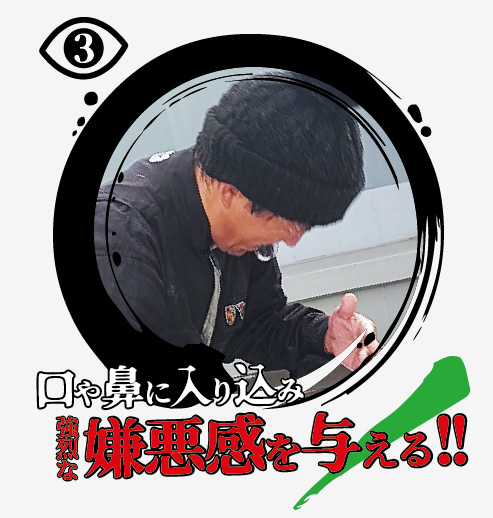 ・約60秒間ジェット噴射し、驚きを与えると同時に口や鼻に入り込み、強烈な嫌悪感を与え闘争心を瞬時に減退させます。