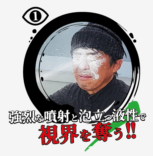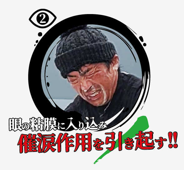 クローズアイに含まれる催涙成分『特殊界面活性物質』は、眼の粘膜に一時的に強烈な刺激を与え、特許処方による3段階の作用によって視界を奪う効果を発揮します。