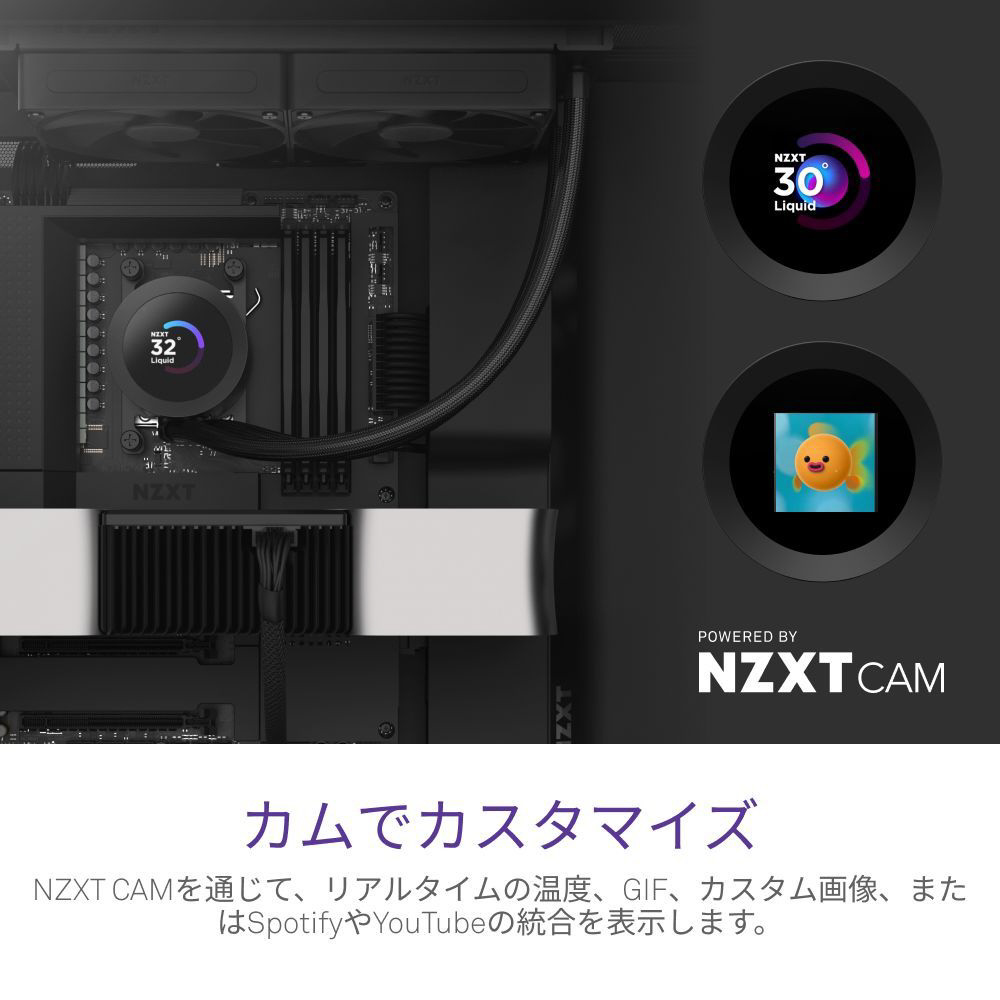 明るい1.54インチの正方形LCDにリアルタイムのシステム温度、アニメーションGIF、カスタム画像、またはSpotifyやYouTubeのようなウェブ統合を表示できます。NZXT CAMソフトウェアを通じて完全にカスタマイズ可能です。