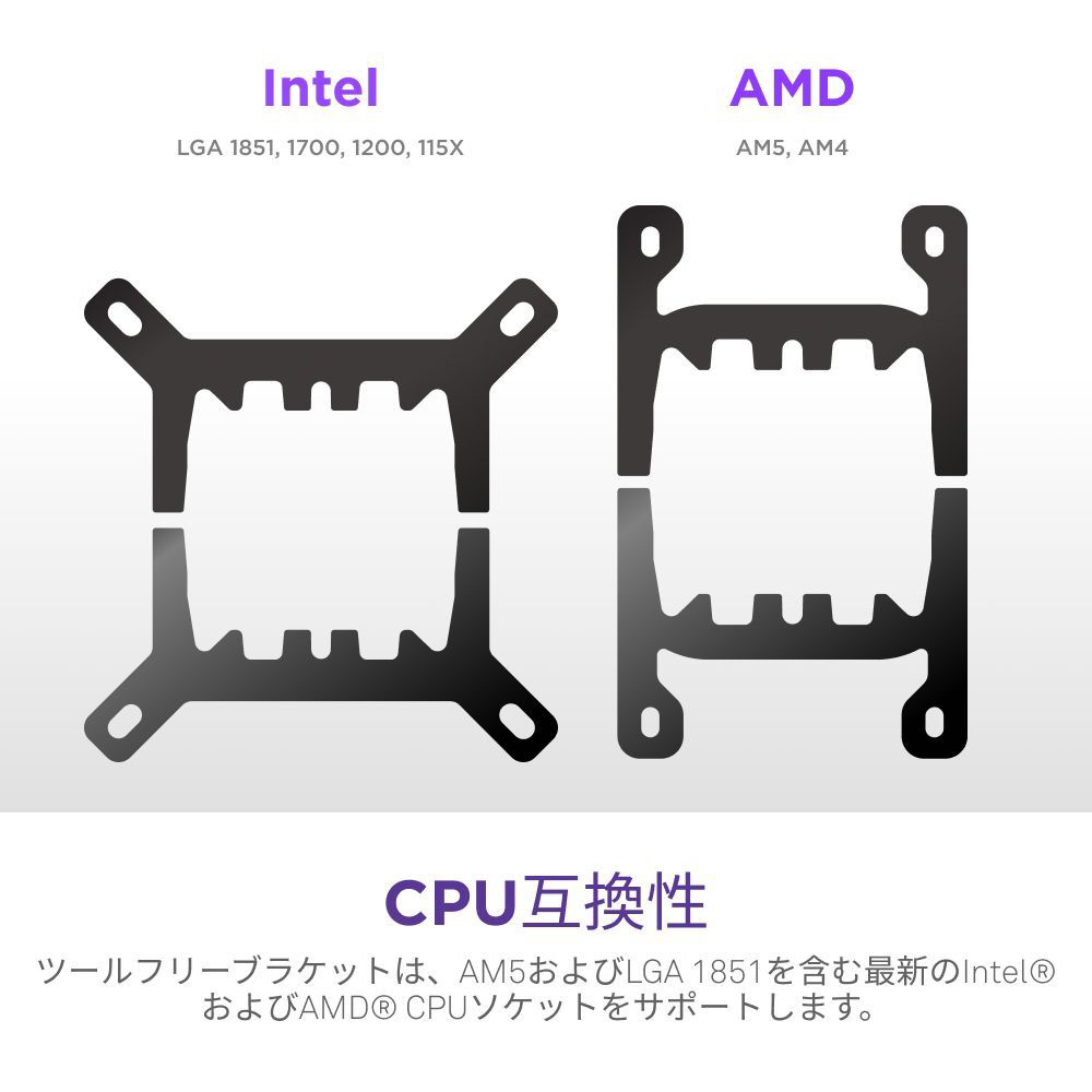 最新のAMDおよびIntel CPUソケット(AM5およびLGA 1851を含む)をサポートするツール不要のマウンティングブラケットが含まれています。