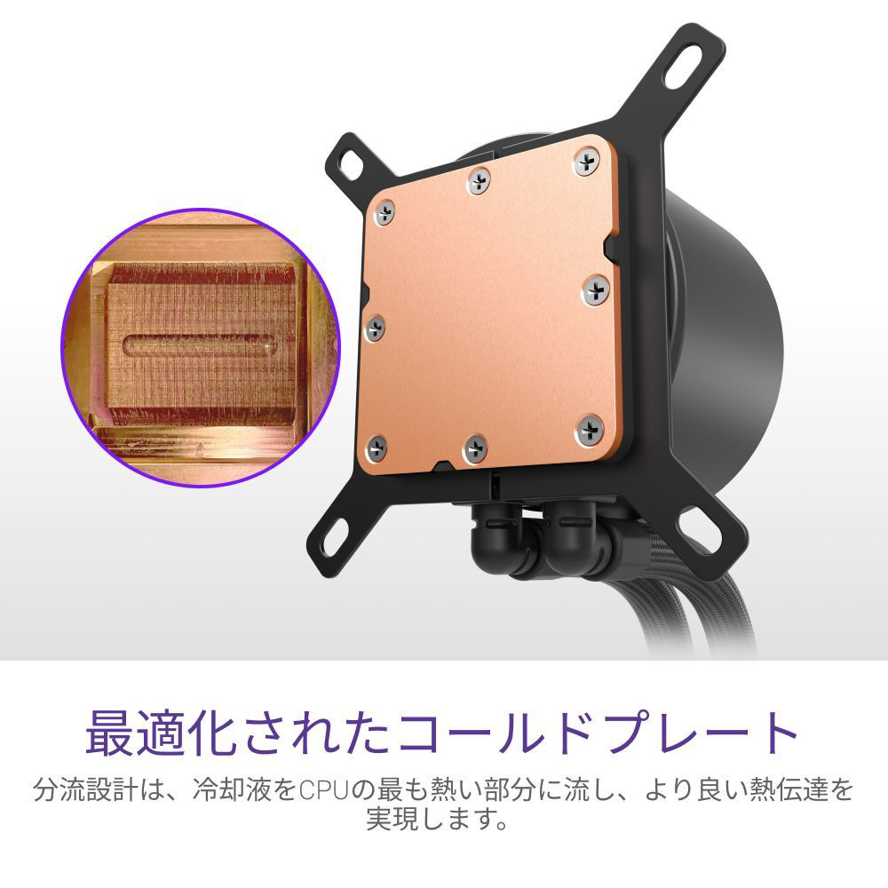 高静圧ファンがラジエーターを通して空気を移動させ、効果的に熱を放散します。ゼロRPMモードでは低負荷時にファンを完全に停止させ、静音動作を実現します。