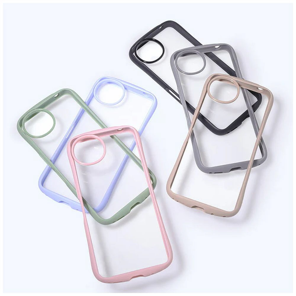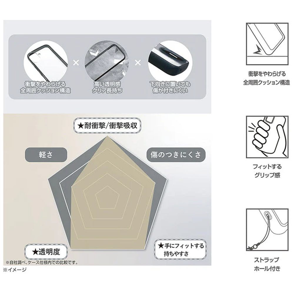 傷に強く黄ばみにくい。衝撃をやわらげる全周囲クッション構造。高い透明感、クリア長持ち。