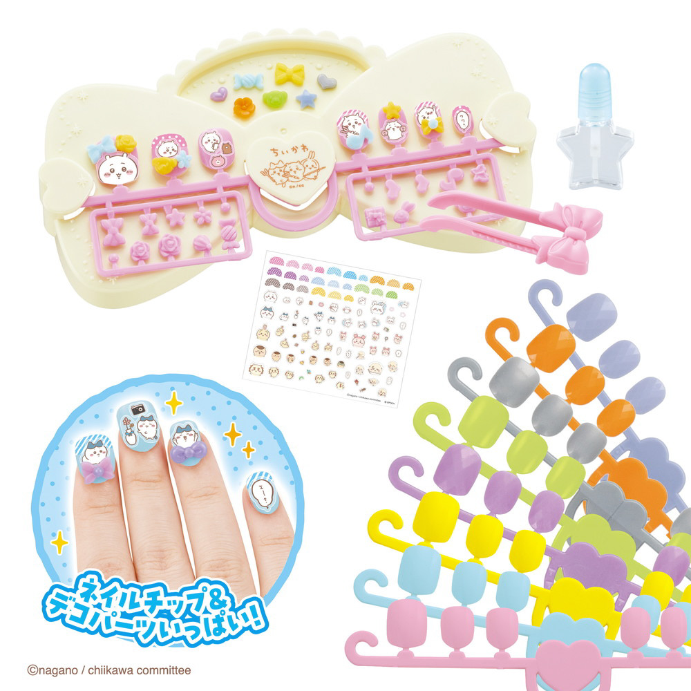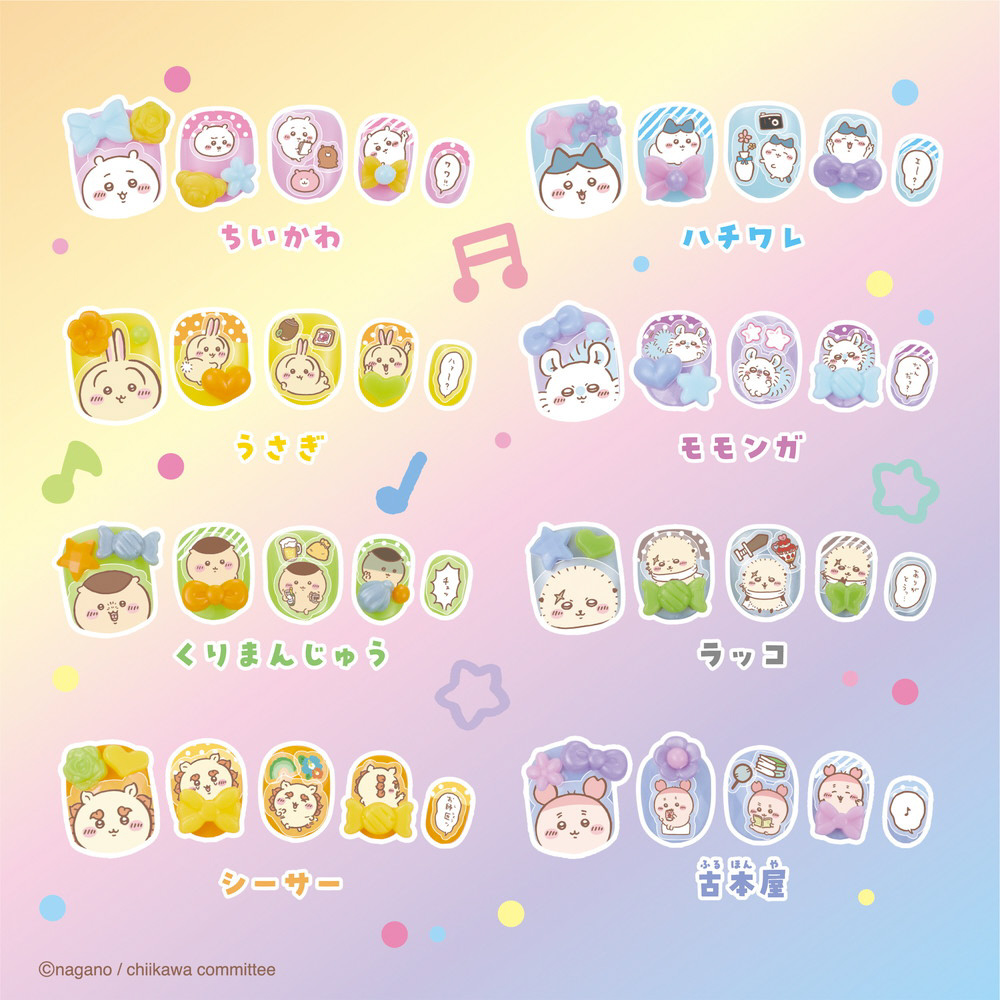 色とりどりのネイルチップ、たくさんのデコパーツとかわいいネイルシールで、ちいかわたちのデコネイルがつくれます。