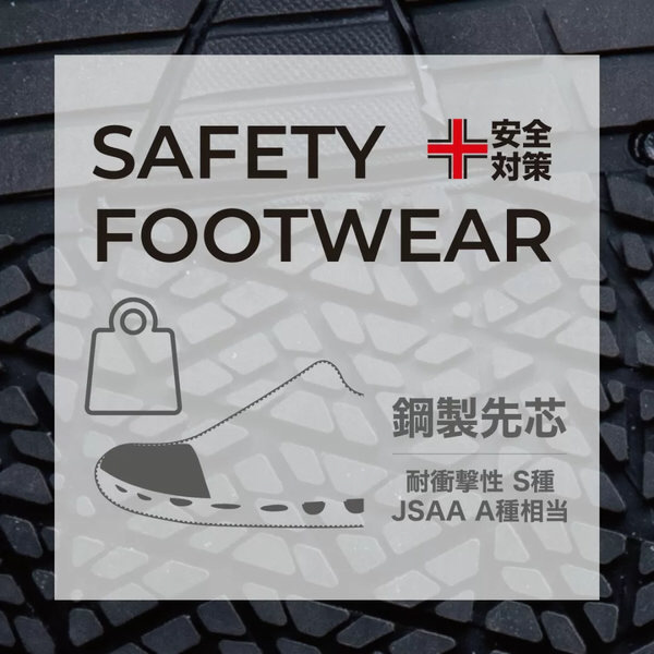 ■材質:先芯(鋼製先芯、JIS S種相当)、アッパー(合成皮革・合成繊維)、ソール(TPU・ゴム)、インソール(EVAメッシュ)