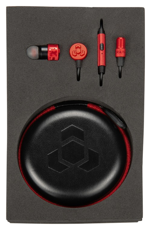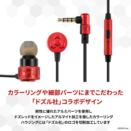 ハウジング、マイク、プラグ部分にはそれぞれオリジナルのアルミニウム切削パーツを使用しており、ドズレッドをイメージしたアルマイトカラーを施しました。さらに、剛性に優れたアルミニウム製のハウジングには、背面にドズル社のマーク、側面にロゴタイプを刻印。イヤホン全体でドズル社仕様に統一されたデザインをお楽しみいただけます。
