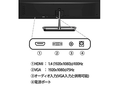 ■インターフェイスはHDMI1.4端子(100Hz対応)を1つとVGA端子(75Hz)を1つ搭載しています。VGA端子を搭載していますので以前から使用しているPCなどとの接続も可能です。