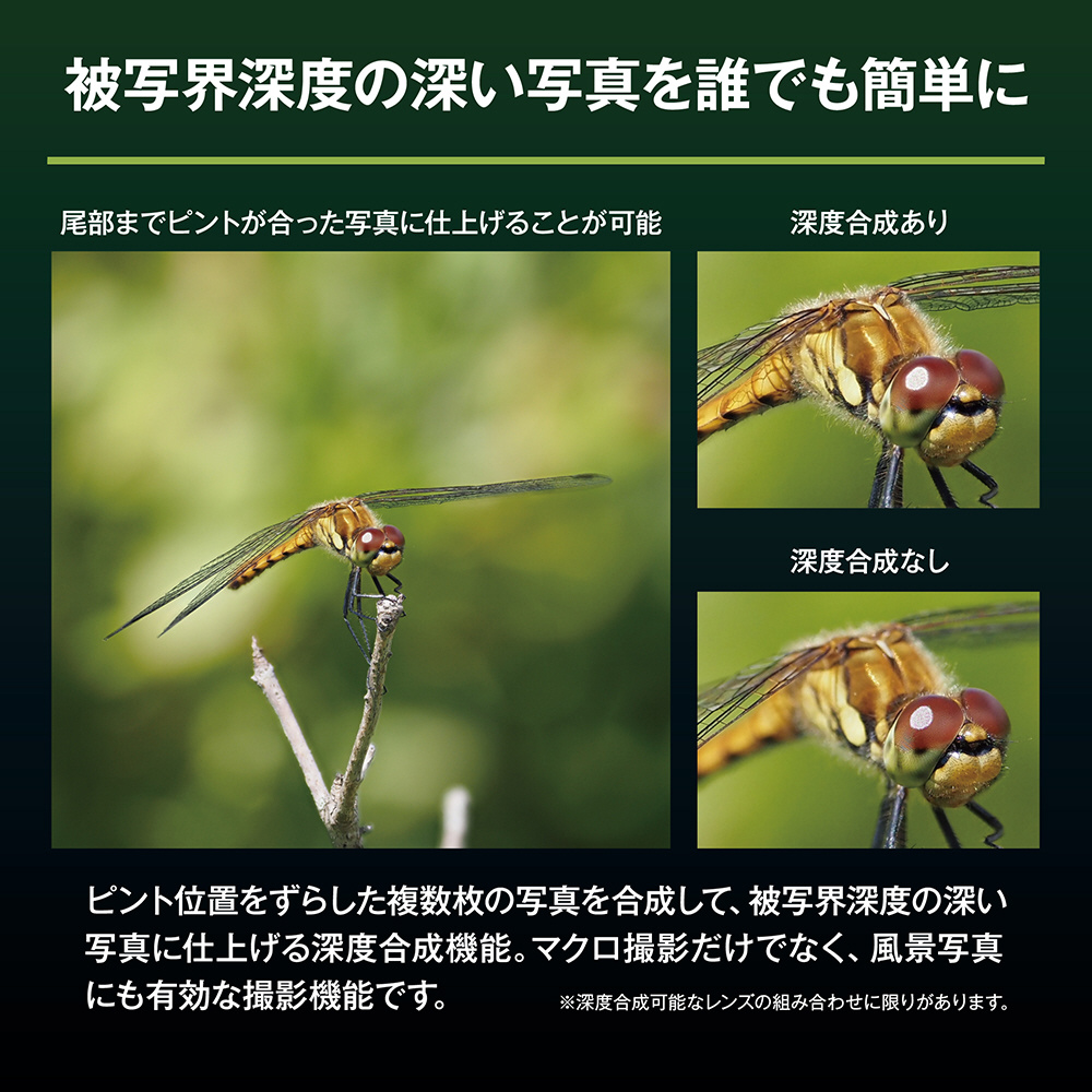 ボディー内5軸手ぶれ補正機構を搭載し、中央最大6.5段、周辺最大5.5段、さらに対応レンズとの組み合わせによる「5軸シンクロ手ぶれ補正」では、中央最大7.5段、周辺最大6.5段の補正効果が得られます。強力な手ぶれ補正により、幅広い条件での手持ち撮影を可能にし、アウトドアで出会うさまざまなシャッターチャンスに瞬時に対応する小型軽量システムといえます。