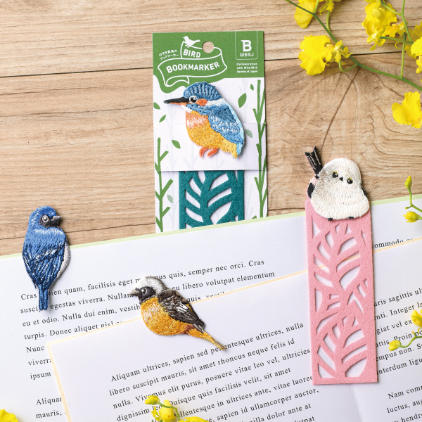 日本の野鳥が本のページからのぞき見ているかわいいしおりです。三鳴鳥に選ばれる美しい鳴き声と、輝く瑠璃色が特徴のオオルリの羽の質感を、繊細な刺繍で丁寧に表現しました。しおり部分は、レースライクなリーフ模様のデザイン。やわらかいフェルト生地なので、本を傷めることもありません。絶滅に瀕している野鳥やその生息地を守る活動に取り組む「日本野鳥の会」に、この商品の売り上げの一部を寄付いたします。