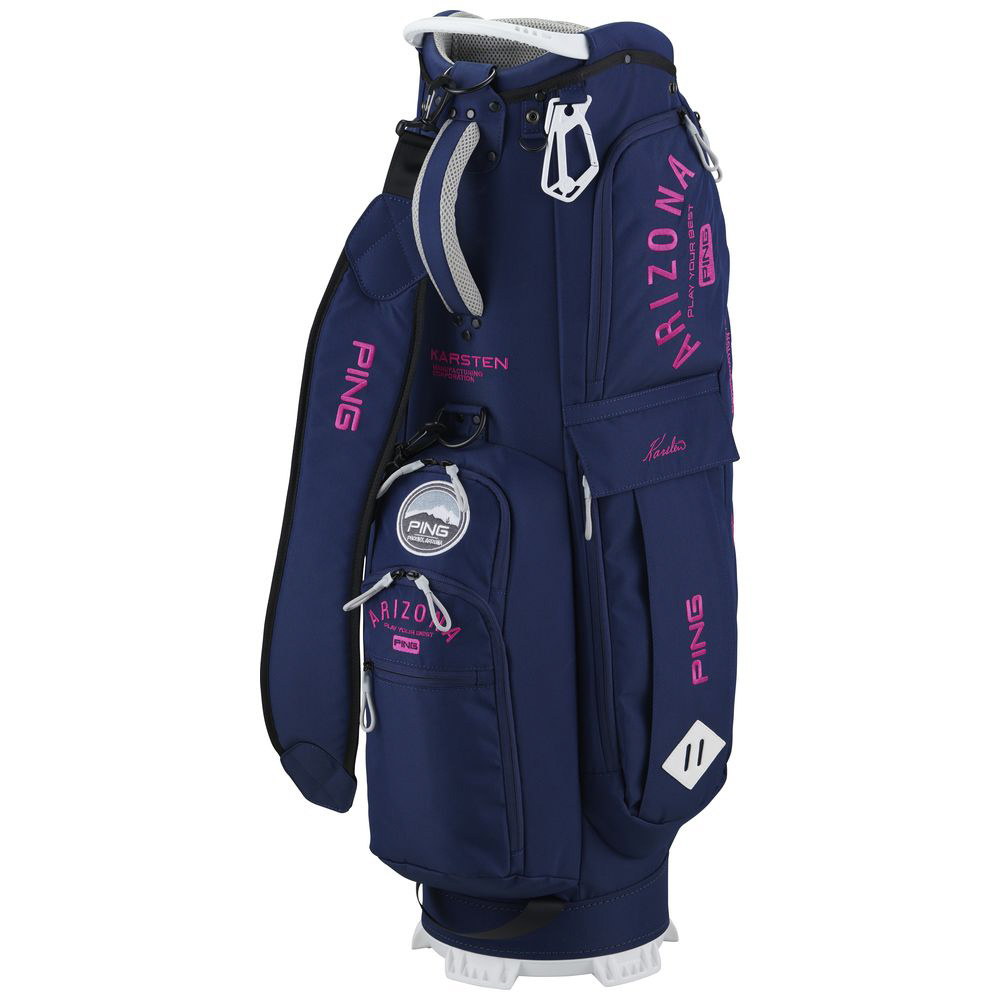カートに乗せ状態でも無駄なく使える機能的なポケット配置のキャディバッグです。