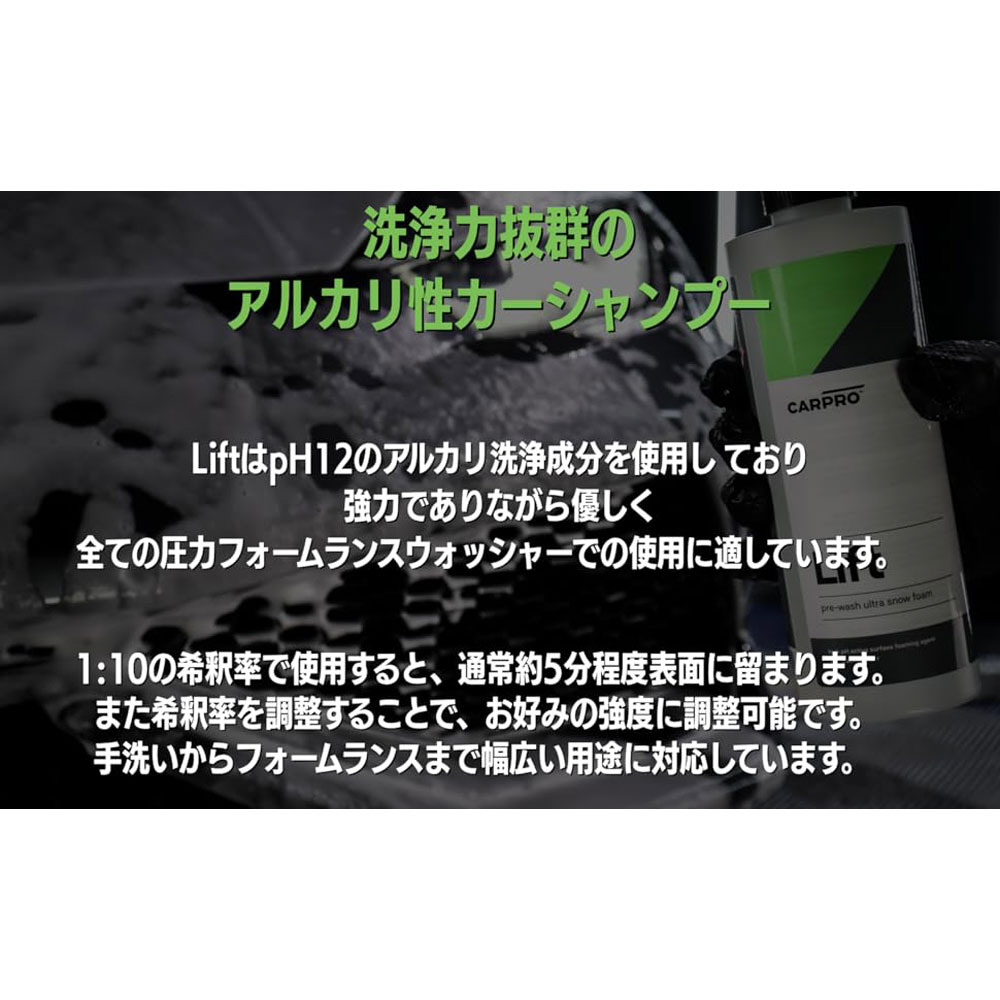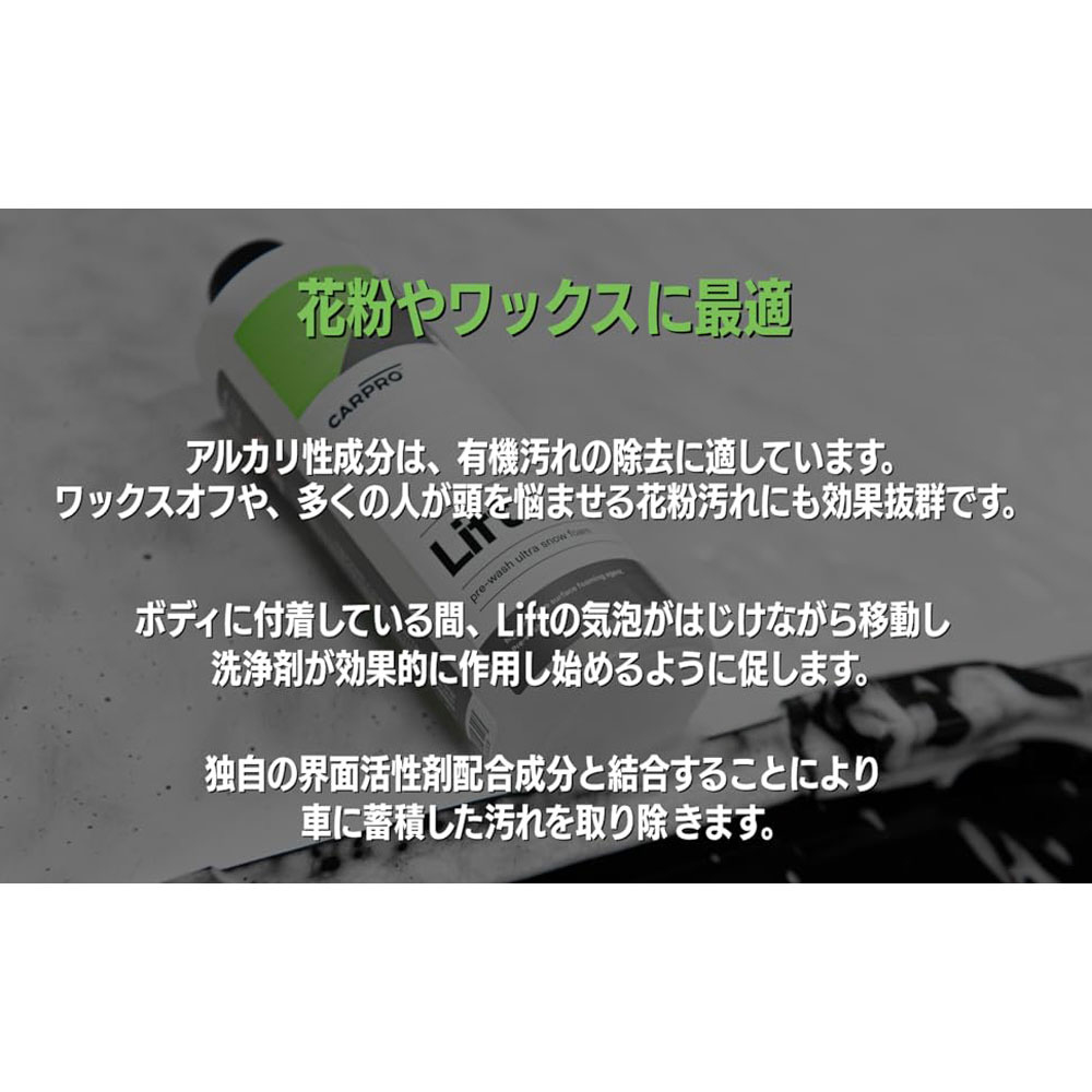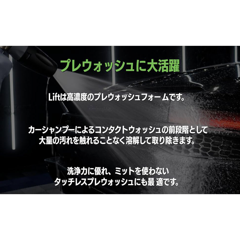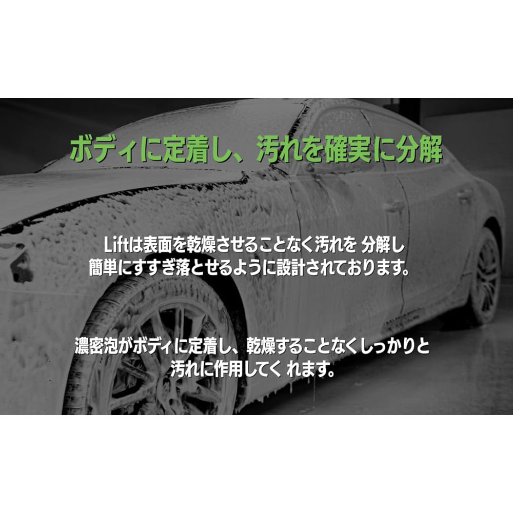 ※LiftはReset に比べ、シーラント、ワックスを除去しやすい性能です。乾燥したボディに直接シャンプー液を吹きかけることで、より泡が定着しやすくなります。