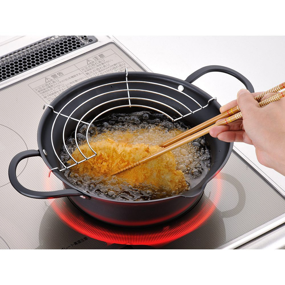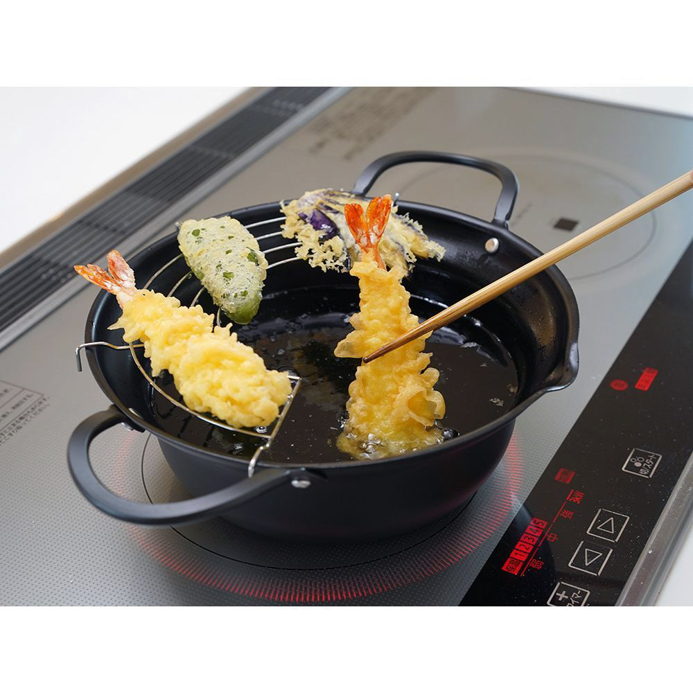 天ぷら鍋は保温性が良く、素材を入れても油の温度が下がりにくい鉄製鍋がおすすめです。油ハネを抑え、油の量も節約できる段付きタイプ。揚げ物の油がきれるアミ付で便利です。油の移し替えがしやすい注ぎ口付です。【仕様】100・200V熱源対応