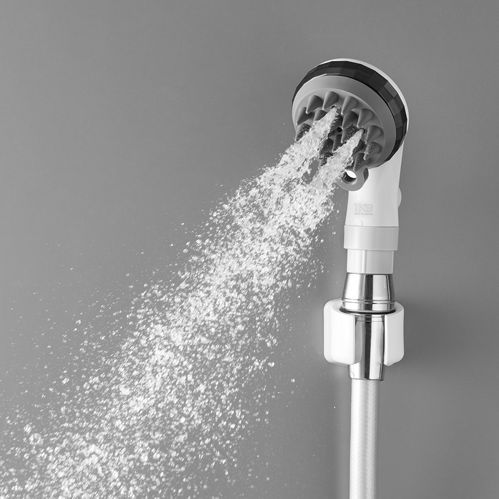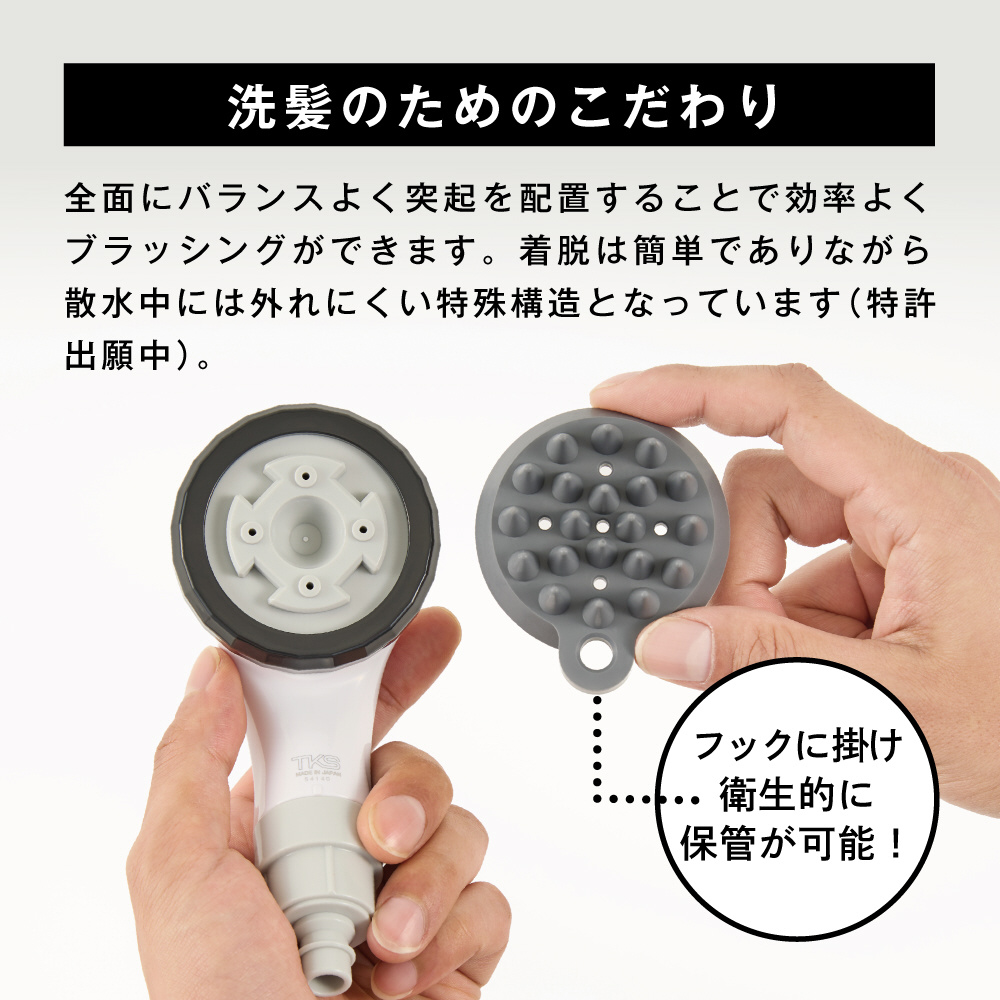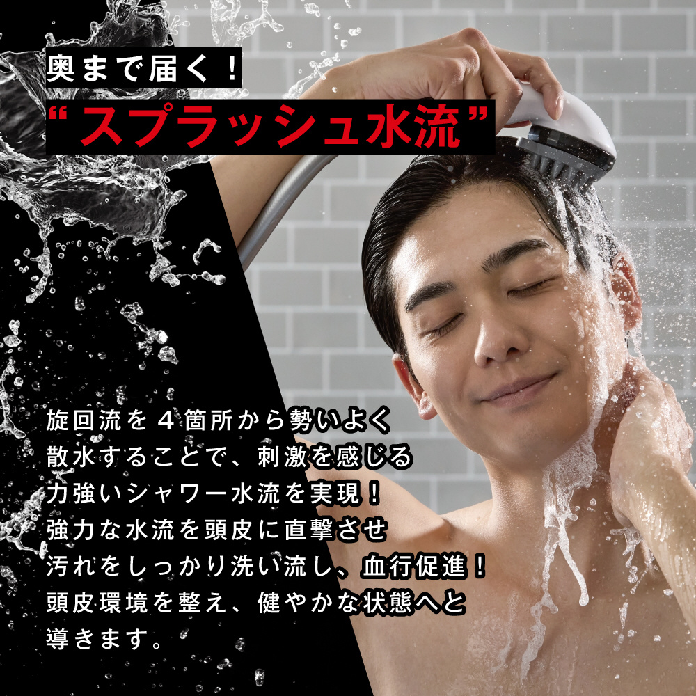 シャワーヘッドとスカルプブラシが一体型になっており、強力な「スプラッシュ水流」とブラシの刺激で頭皮環境を整えます。