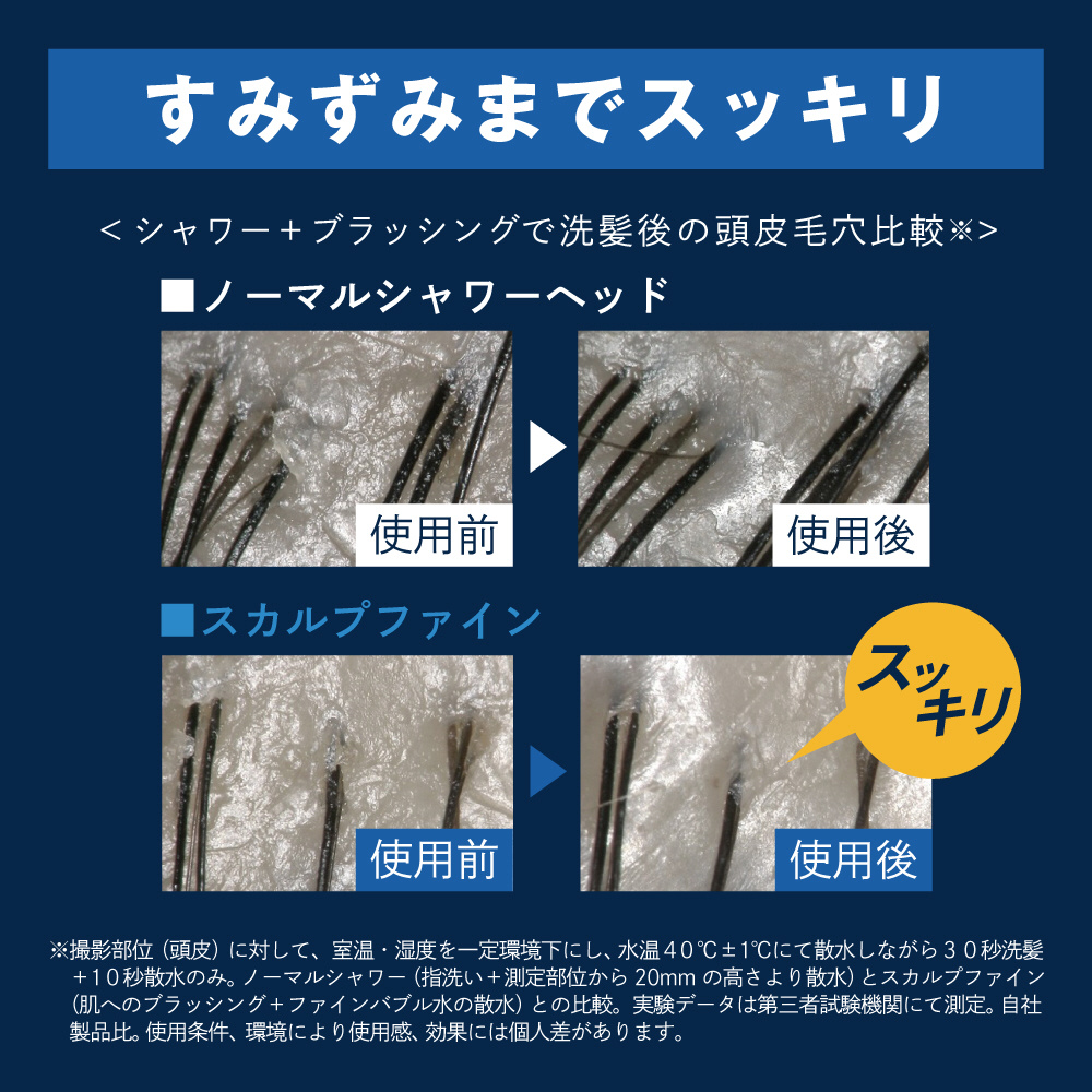 ブラシの刺激と水流・ファインバブルの作用により、通常のシャワーヘッドと比較して皮脂除去率は約15% UP(※1)、使用後の頭皮の平均血流量が約5% UPし血行促進(※2)、また使用後の肌表面温度は約23%UP(※3)!